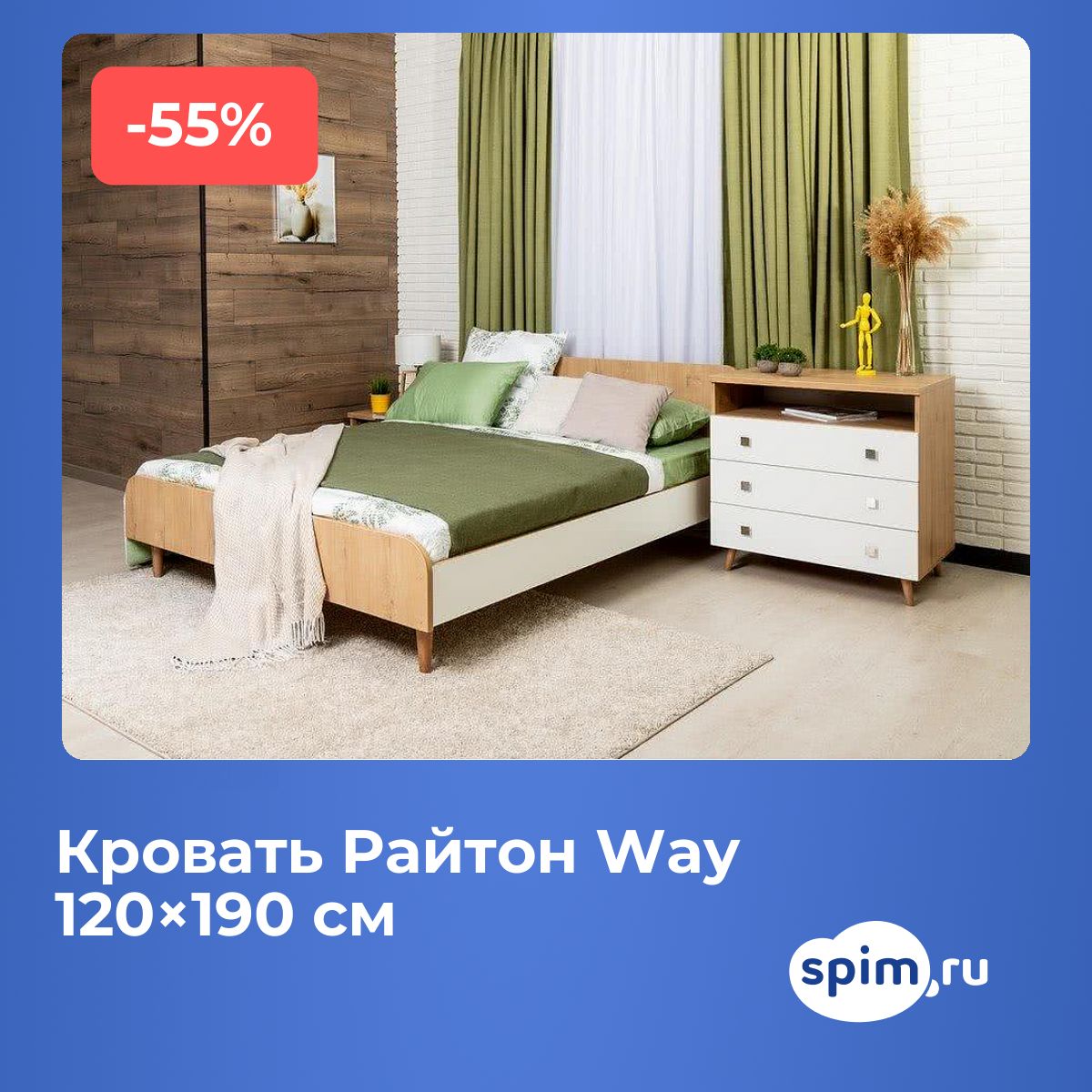Компактная корпусная кровать на деревянных опорах понравится не только любителям скандинавского стиля.Небольшие габариты кровати займут немного места в квартире-студии или в комнате с маленькой площадью. Сразу притягивает взгляд древесный рисунок спинок из усиленного ЛДСП (толщиной 25 мм). Нейтральные цвета царг — белый и серый — понравятся как взрослым, так и детям. Наклонные опоры из бука выдерживают усиленные нагрузки на изделие и создают визуальную легкость модели, при этом они достаточно высокие и очень удобны для быстрой и легкой уборки. > Материал: спинки — ЛДСП 25 мм, царги — ЛДСП 16 мм. Основание встроенное деревянное с березовыми ламелями, опоры из массива бука цвета Антик. Размер спального места, см: 90/120/140/160/180х190/200 Рекомендуемая высота матраса, см: 15-22 Высота габаритная, см: 80 Высота боковины, см: 18 Просвет над полом, см: 17,4 Углубление под матрас, см: 5,55 Высота изножья, см: 43 Максимальная нагрузка на 1 спальное место, кг: 120 Матрас и мебель в стоимость не входят.