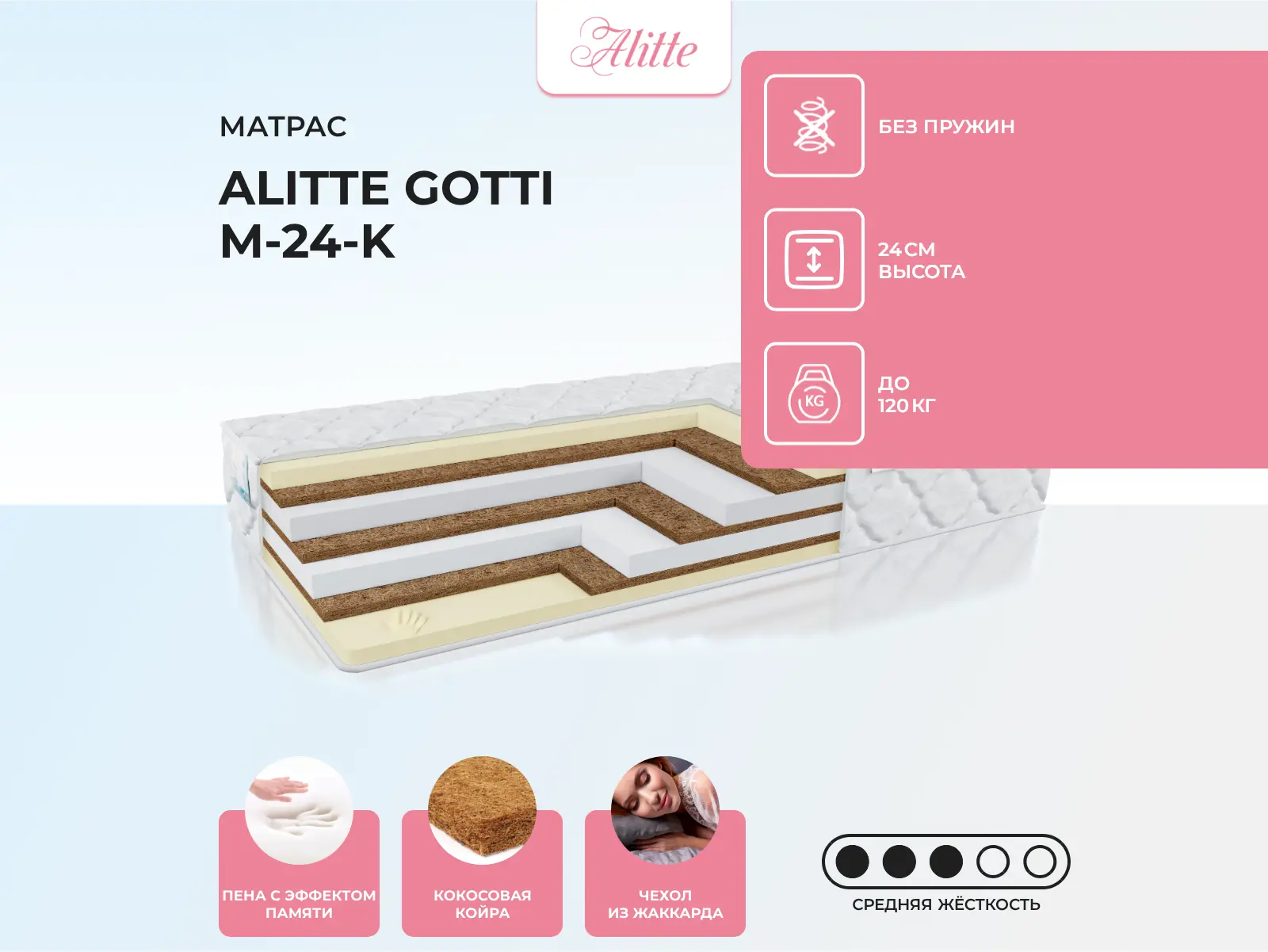 Матрас «Alitte Gotti M-24-K» — средней жесткости, которая подходит большинству людей среднего телосложения. Это — оптимальный вариант и детям, и взрослым, и пожилым людям.