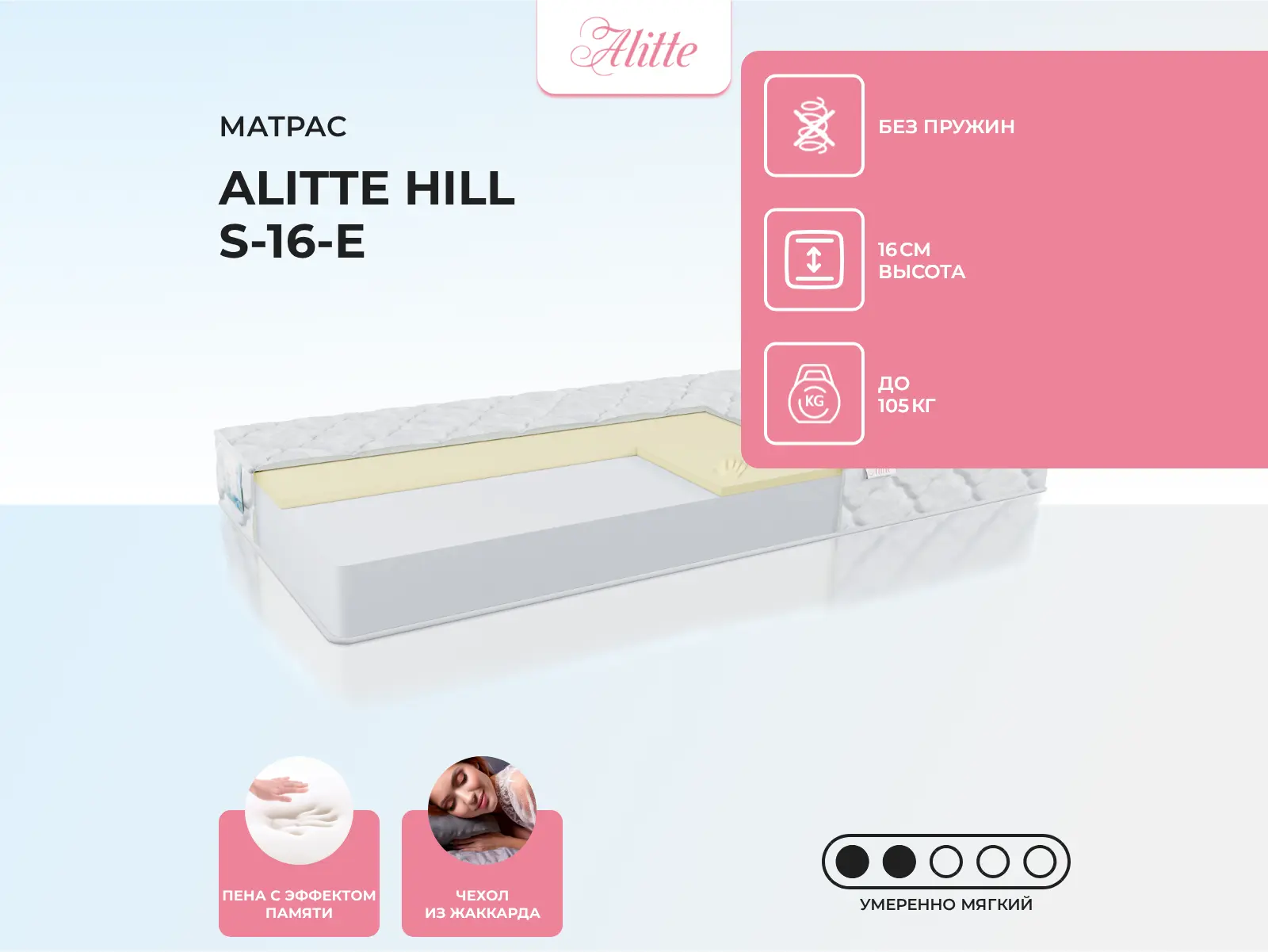 Средне-мягкий матрас «Alitte Hill S-16-E» — для настоящего ценителя комфорта. Такая модель хорошо подходит людям с небольшим весом.