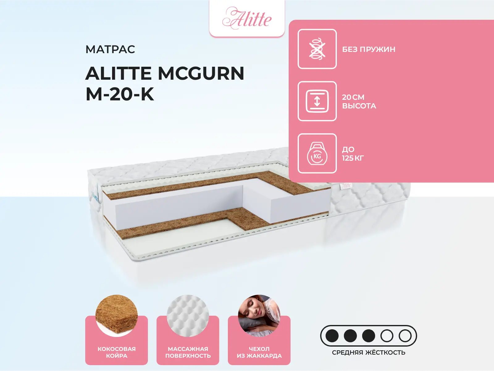 Матрас «Alitte McGurn M-20-K» — средней жесткости, которая подходит большинству людей среднего телосложения. Это — оптимальный выбор и детям, и взрослым, и пожилым людям.