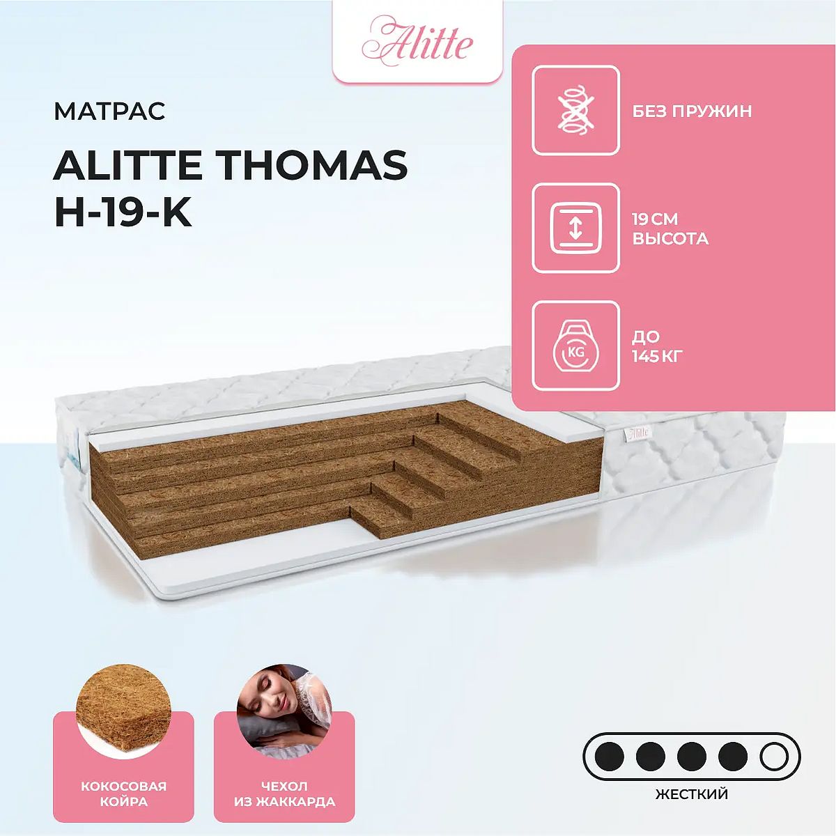 Матрас высокой жесткости «Alitte Thomas H-19-K» — оптимальный выбор для уверенной поддержки позвоночника. Именно такие модели обычно рекомендуют подросткам, спортсменам или людям с проблемами позвоночника.