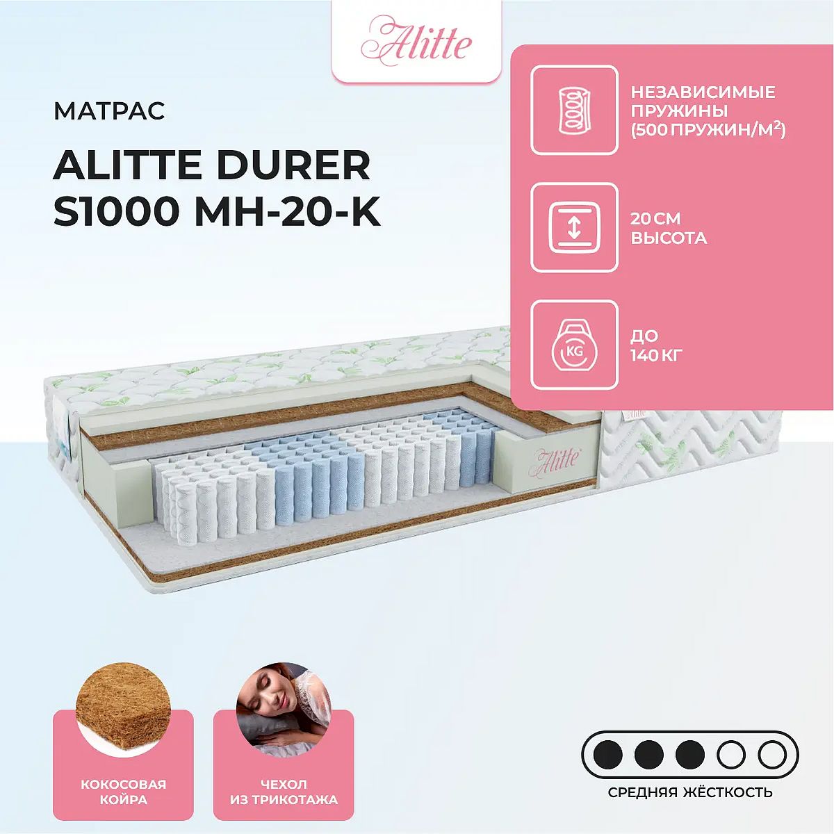 Матрас «Alitte Durer S1000 MH-20-K» — средней жесткости, которая комфортна большинству людей среднего телосложения. Это — универсальный выбор и детям, и взрослым, и пожилым людям.