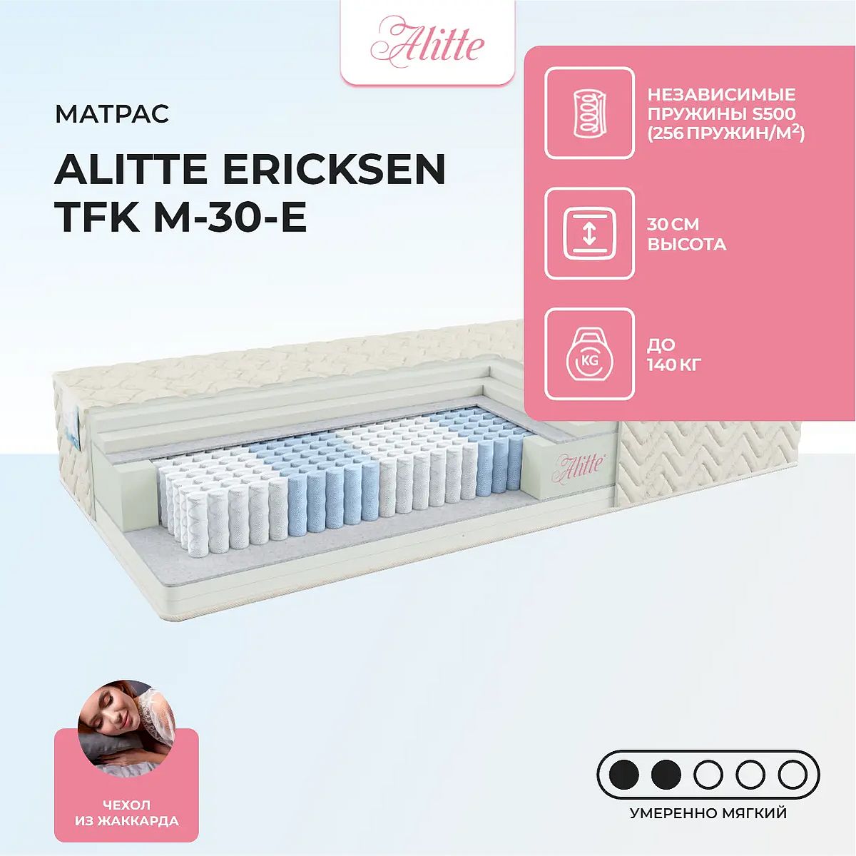 Средне-мягкий матрас «Alitte Ericksen TFK M-30-E» просто создан для настоящего ценителя комфорта. Такой вариант отлично подходит людям с небольшим весом.