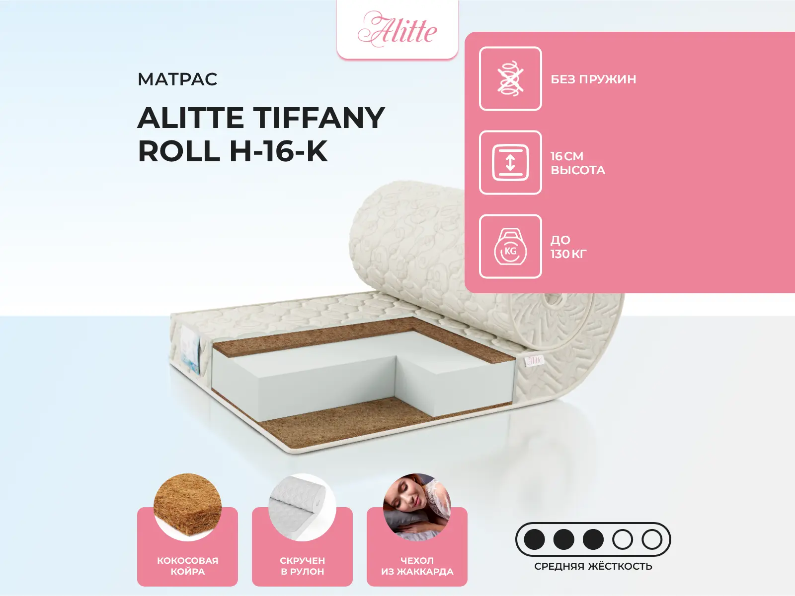 Матрас «Alitte Tiffany Roll H-16-K» — средней жесткости, которая комфортна большинству людей среднего телосложения. Это — оптимальный вариант и детям, и взрослым, и пожилым людям.