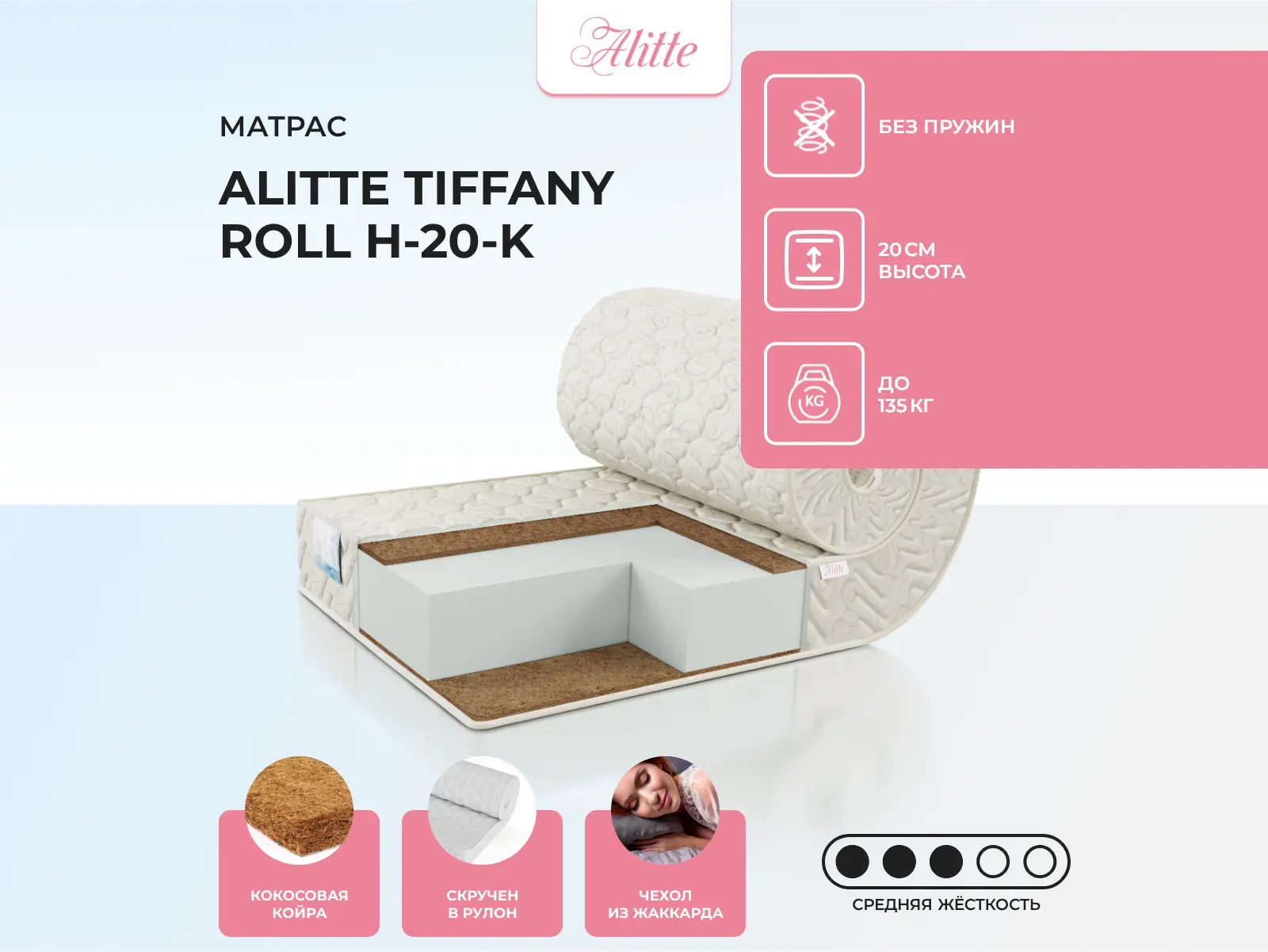 Матрас «Alitte Tiffany Roll H-20-K» — средней жесткости, которая комфортна большинству людей среднего телосложения. Это — оптимальный выбор и детям, и взрослым, и пожилым людям.
