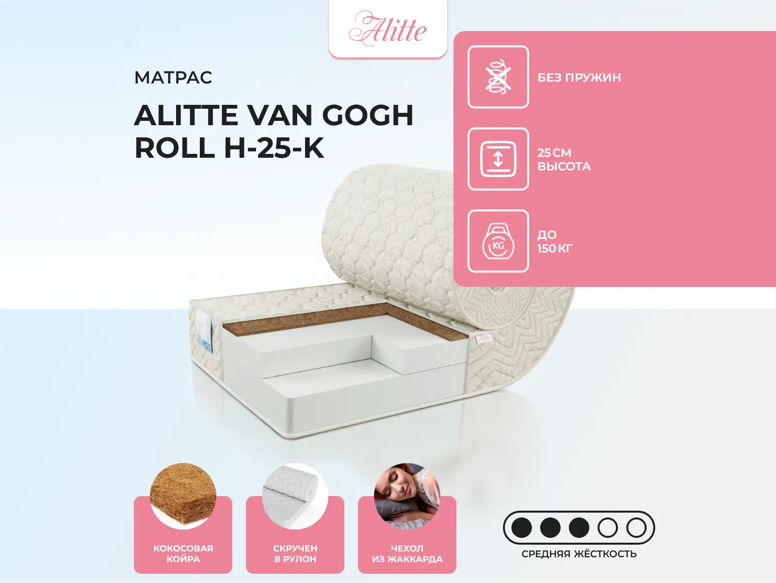 Матрас «Alitte Van Gogh Roll H-25-K» — средней жесткости, которая комфортна большинству людей среднего телосложения. Это — оптимальный выбор и детям, и взрослым, и пожилым людям.