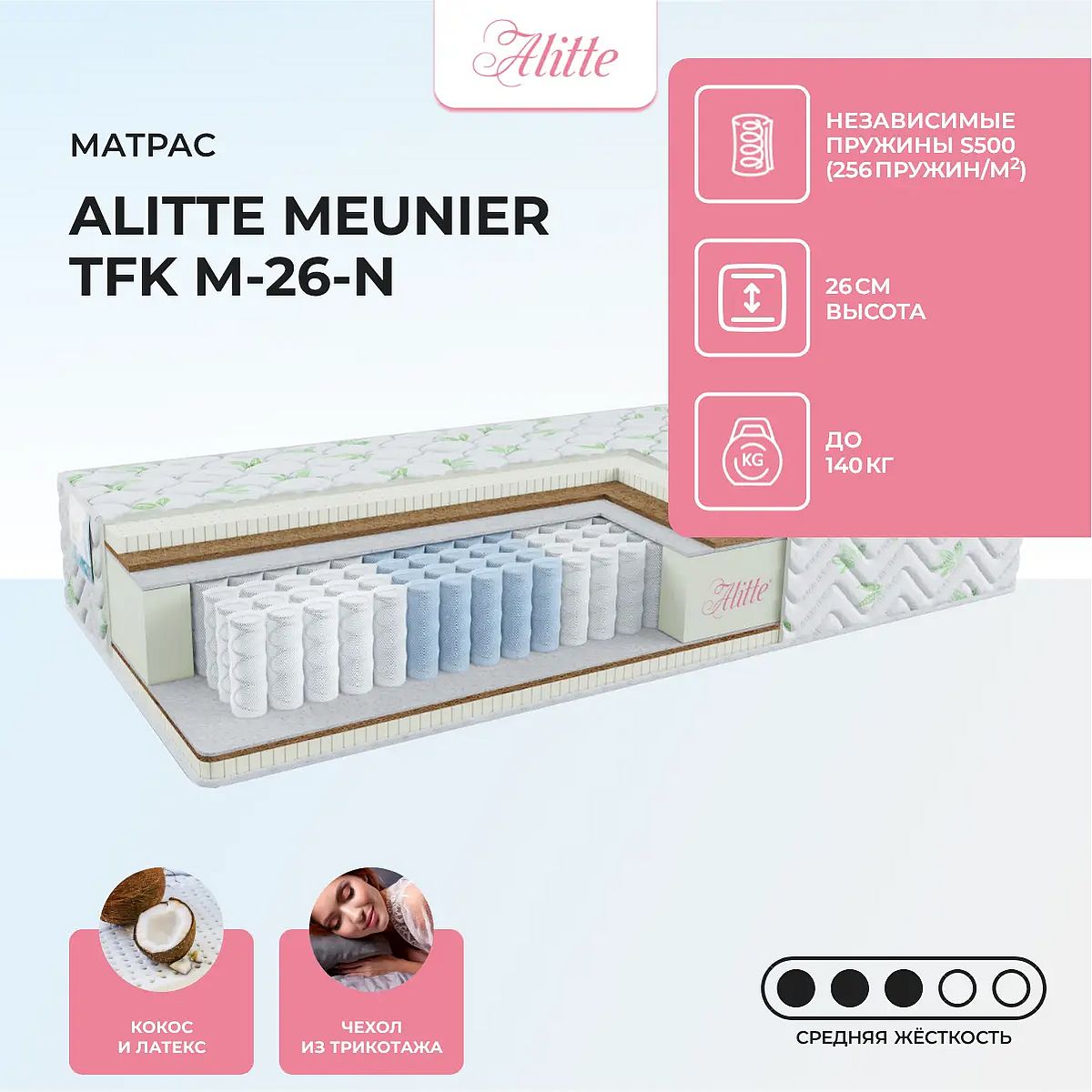 Матрас «Alitte Meunier TFK M-26-N» — средней жесткости, которая комфортна большинству людей среднего телосложения. Это — универсальный выбор и детям, и взрослым, и пожилым людям.