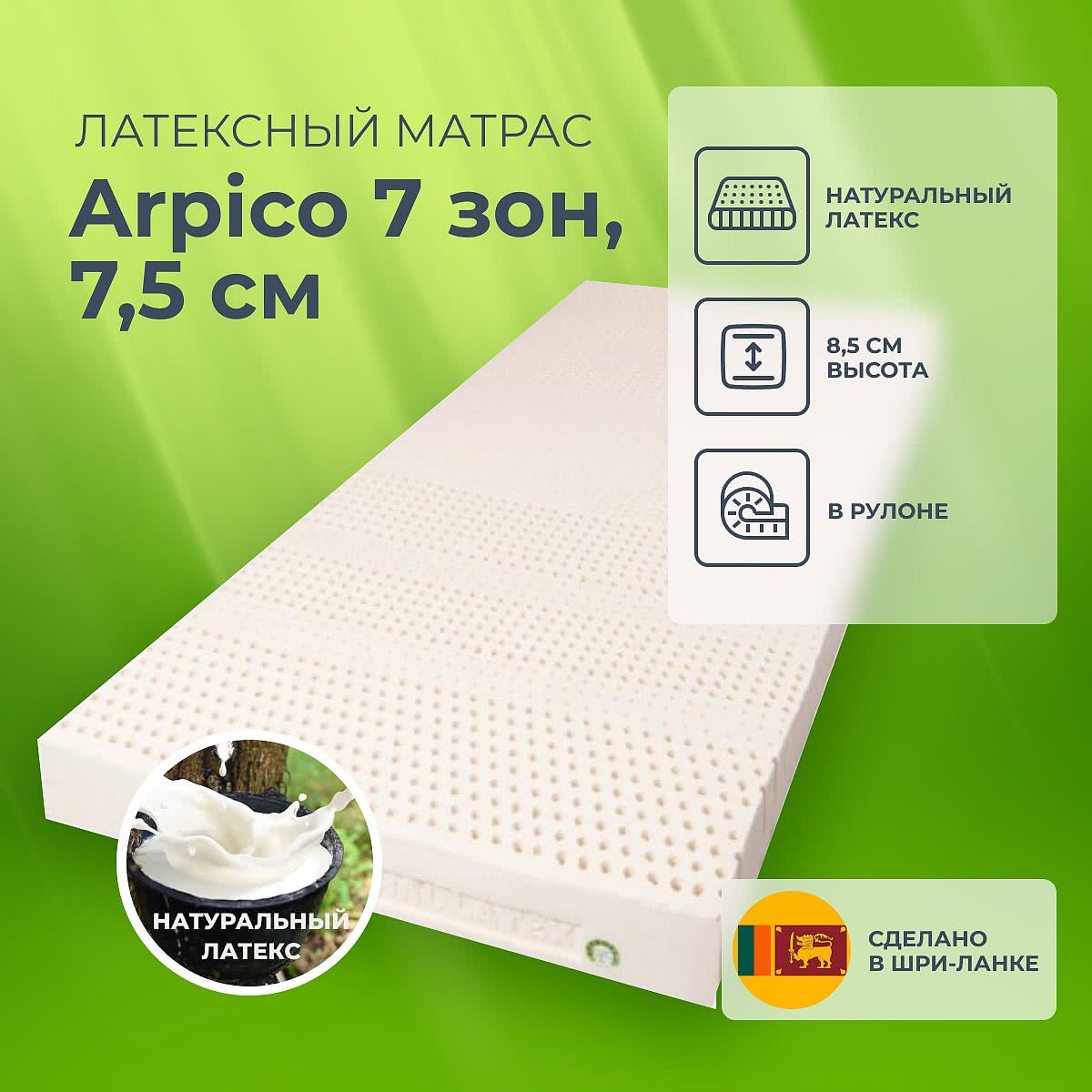 Средне-мягкий матрас «Arpico Латексный 7 зон, 7,5 см» — для истинного ценителя комфорта. Такой вариант отлично подойдет людям с небольшим весом.