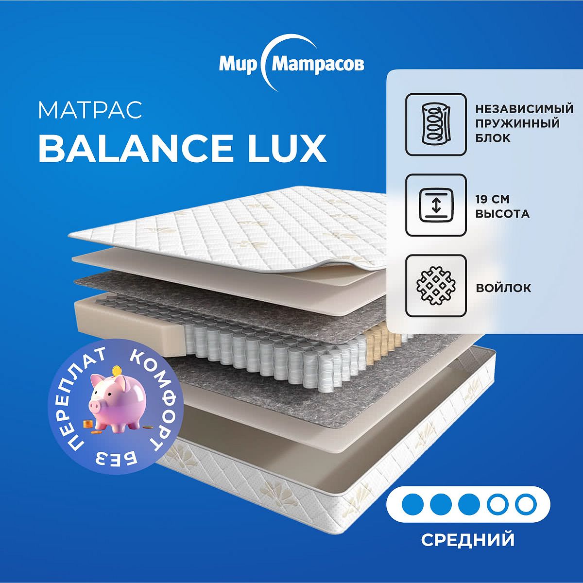 Матрас «Мир матрасов Balance Lux» — средней жесткости, которая комфортна большинству людей среднего телосложения. Это — универсальный вариант и детям, и взрослым, и пожилым людям.