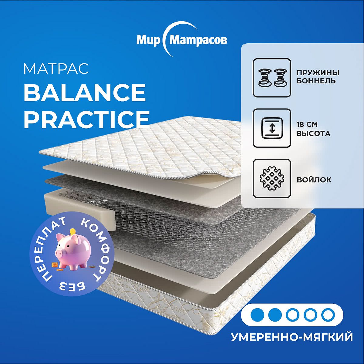 Средне-мягкий матрас «Мир матрасов Balance Practice» просто создан для истинного ценителя комфорта. Такая модель отлично подойдет людям с небольшим весом.
