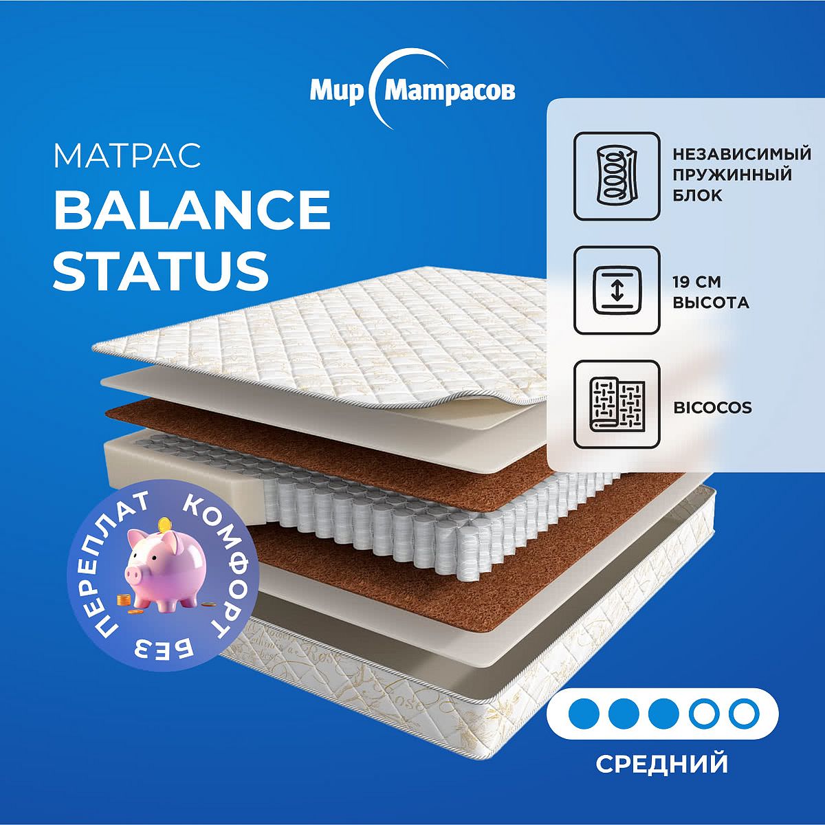 Матрас «Мир матрасов Balance Status» — средней жесткости, которая комфортна большинству людей среднего телосложения. Это — оптимальный вариант и детям, и взрослым, и пожилым людям.