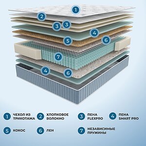 Периметр блока усилен пружинами классической формы, которые имеют два дополнительных витка сверху и снизу для усиленной поддержки. Пружина сжата до уровня классической пружины и постоянно находится под высоким давлением. Пена высокой плотности Smart Edge Foam расположена по всему периметру матраса, обеспечивая его усиление. Тандем с пружинным блоком с повышенной жесткостью по краям позволяет увеличить площадь спальной поверхности до 10%. Пена Smart Pro с технологией Breath ProПолная воздухопроницаемость.Увеличенный размер ячеек улучшает приток воздуха и предотвращает накопление влаги. В результате повышается воздухопроницаемость, которая, согласно исследованиям, в 30 раз выше, чем у обычной пены. Упругость. Технология Breath Pro способствует максимальному комфорту и усиленной поддержке. Благодаря использованию такой плотной пены матрас лучше поддерживает тело во время сна и отличается долгим сроком службы. Чехол из премиального трикотажаВ матрасах Seria Pro используется премиальный трикотаж с ультрамягкой пропиткой Bio Care. Пропитка Bio Care способствует поддержанию баланса влаги в организме и созданию более качественных условий для сна с отличным эффектом. Также она сдерживает рост микроорганизмов, делает ткань необыкновенно мягкой и роскошной.Система комфортности Smart Airflow, которая обеспечивает дополнительную вентиляцию и идеальный микроклимат спального места. Особая трехмерная поперечная структура волокон создает вентиляционный слой воздуха внутри материалов. Состав стежки чехла: