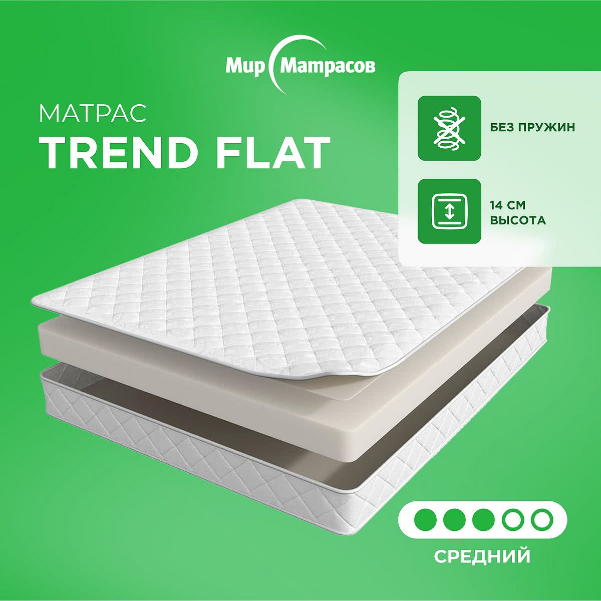 Беспружинный матрас Trend Flat среднего уровня жёсткости. В составе — 12 см высокоэластичной пены. Высота матраса — 14 сантиметров. Поставляется в несъёмном жаккардовом чехле, стёганом на синтепоне. Матрас не скручивается.