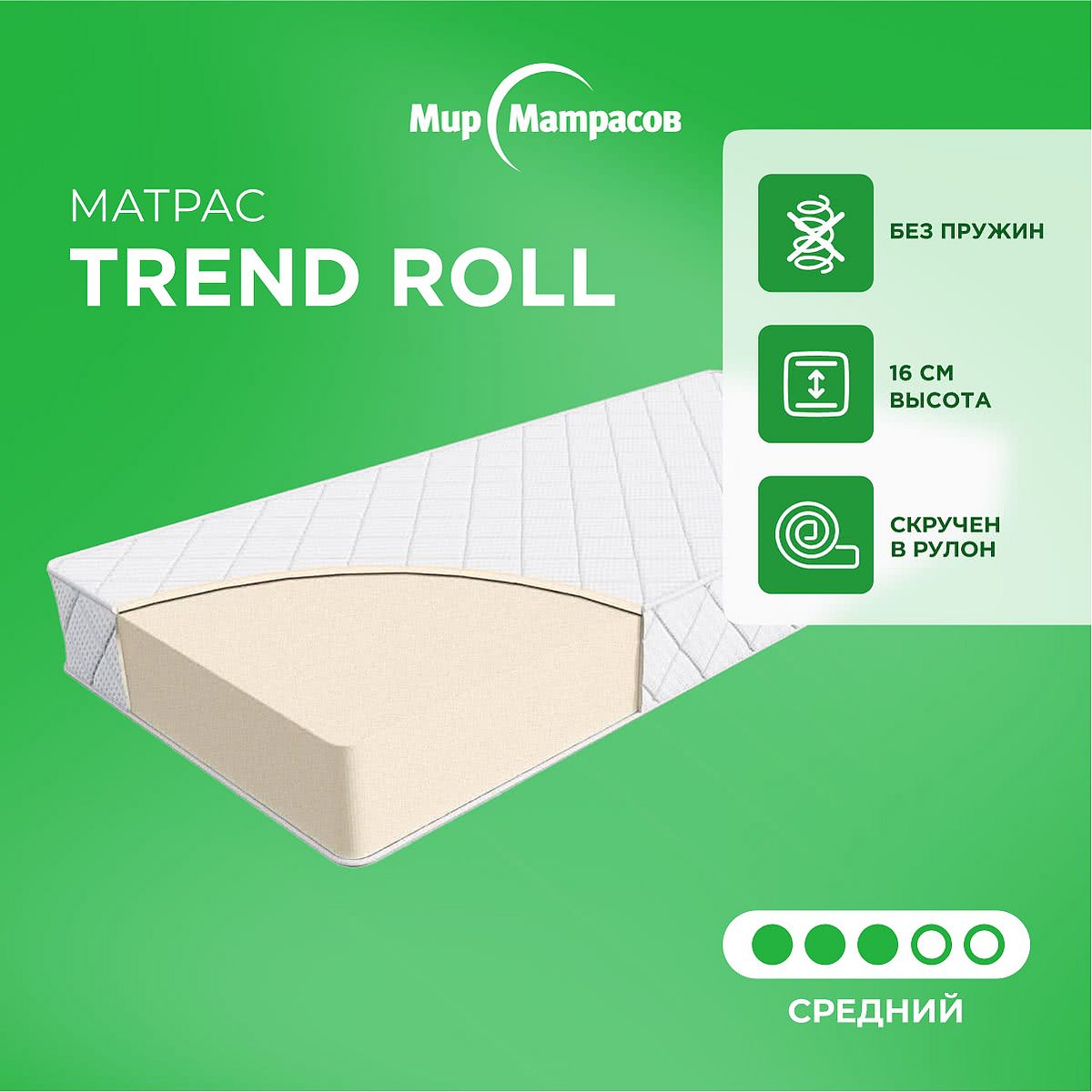 Матрас «Мир матрасов Trend Roll» — средней жесткости, которая подходит большинству людей среднего телосложения. Это — универсальный вариант и детям, и взрослым, и пожилым людям.