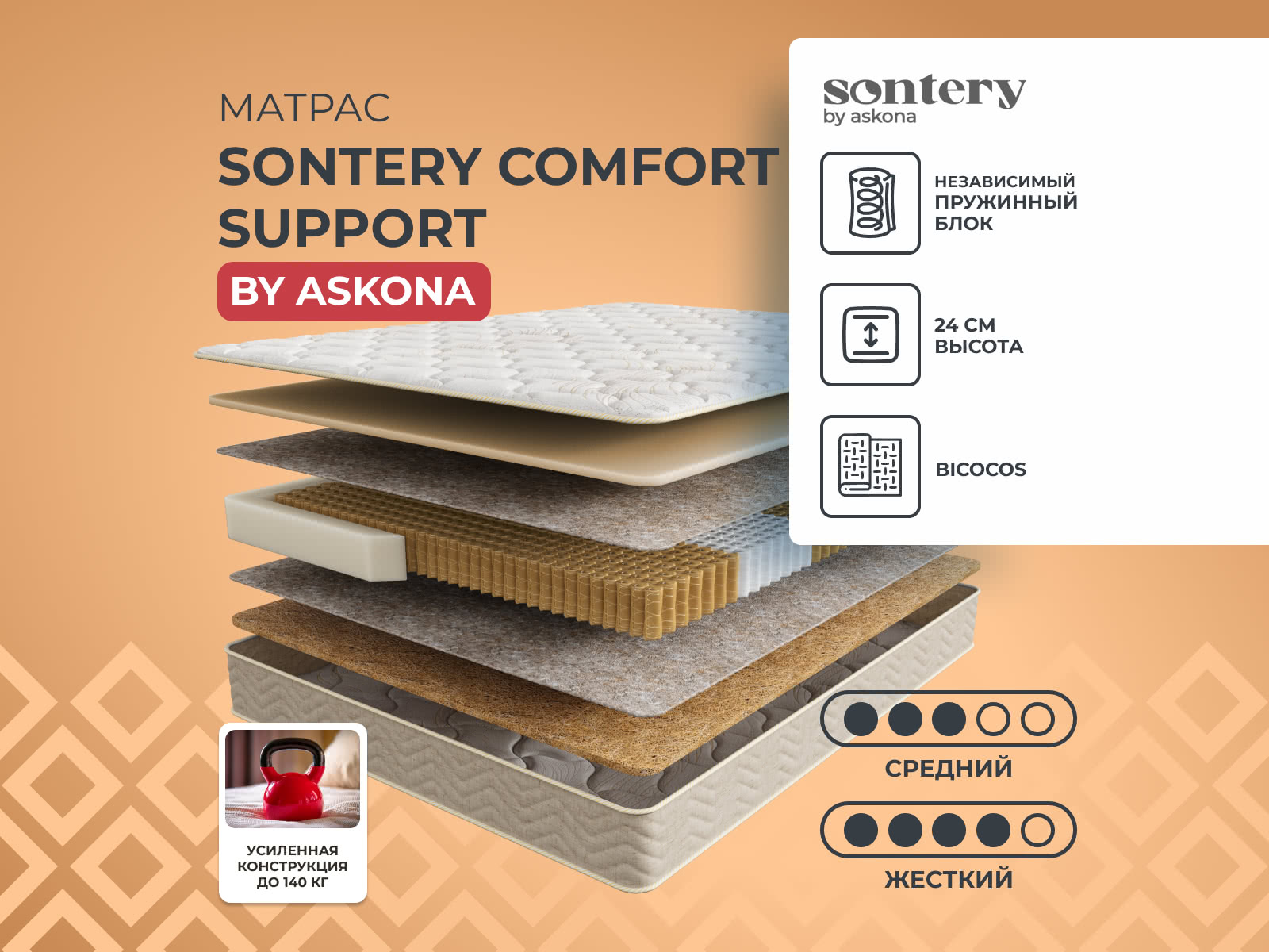 Пружинный блок матраса Comfort Support выполнен из более толстой проволоки, за счет чего выдержит повышенные нагрузки.