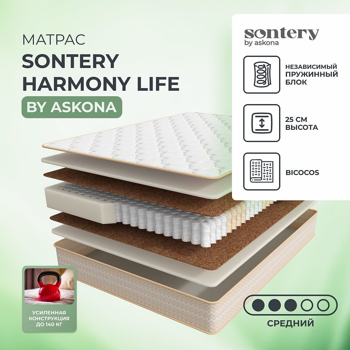 Матрас «Sontery by Askona Life» — средней жесткости, которая подходит большинству людей среднего телосложения. Это — универсальный вариант и детям, и взрослым, и пожилым людям.