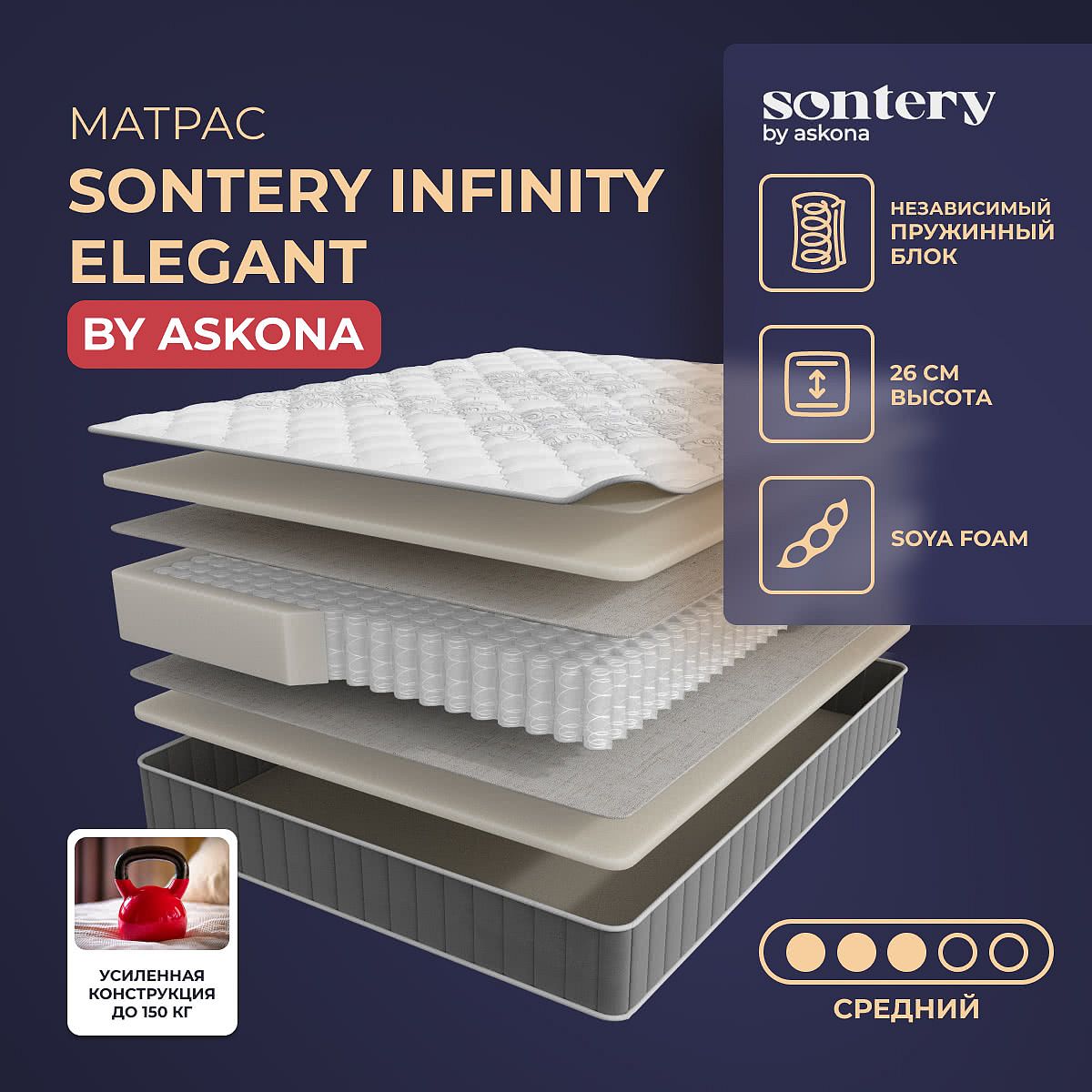 Матрас «Sontery by Askona Elegant» — средней жесткости, которая подходит большинству людей среднего телосложения. Это — универсальный выбор и детям, и взрослым, и пожилым людям.
