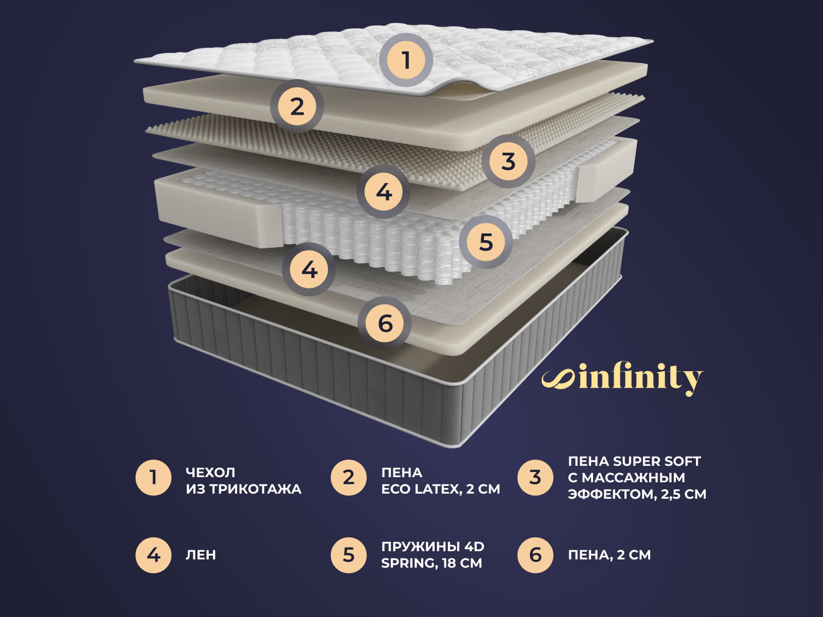 Коллекция InfinityУникальная коллекция, в составе которой используются инновационные материалы повышенной износостойкости и долговечности.Состав одностороннего матраса: