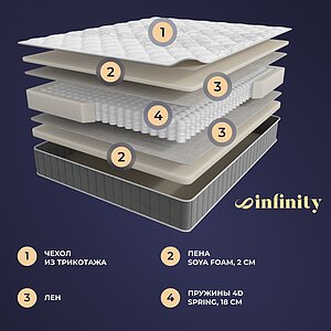 Коллекция InfinityУникальная коллекция, в составе которой используются инновационные материалы повышенной износостойкости и долговечности.Состав матраса:
