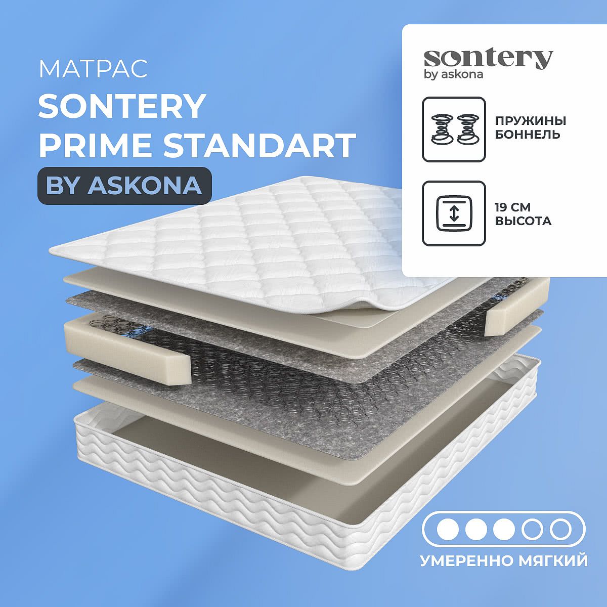 Средне-мягкий матрас «Sontery by Askona Standart» просто создан для настоящего ценителя комфорта. Такая модель хорошо подойдет людям с небольшим весом.