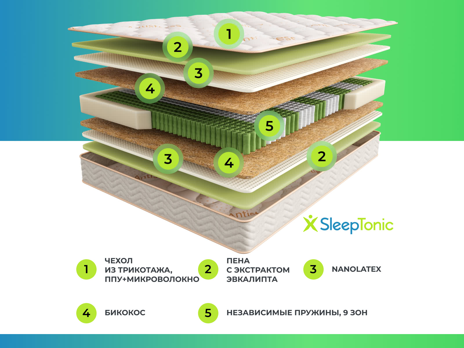 Максимальная нагрузка на спальное место: до 140 кг. Высота матраса: 27 см. Несъемный мягкий трикотажный чехол с волокнами эвкалипта. Бурлет из износостойкой жаккардовой ткани с высокой воздухопроницаемостью. Высокообъемная стежка на пене и микроволокне повышает комфорт спального места, увеличивая мягкость. Основные преимущества коллекции Sleep Tonic