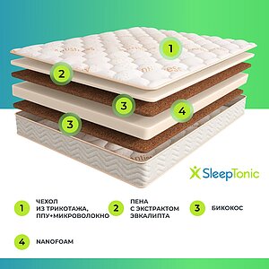 Нагрузка на спальное место: без ограничений. Высота матраса: 23 см. Несъемный мягкий трикотажный чехол с волокнами эвкалипта. Бурлет из износостойкой жаккардовой ткани с высокой воздухопроницаемостью. Высокообъемная стежка на пене и микроволокне повышает комфорт спального места, увеличивая мягкость. Основные преимущества коллекции Sleep Tonic