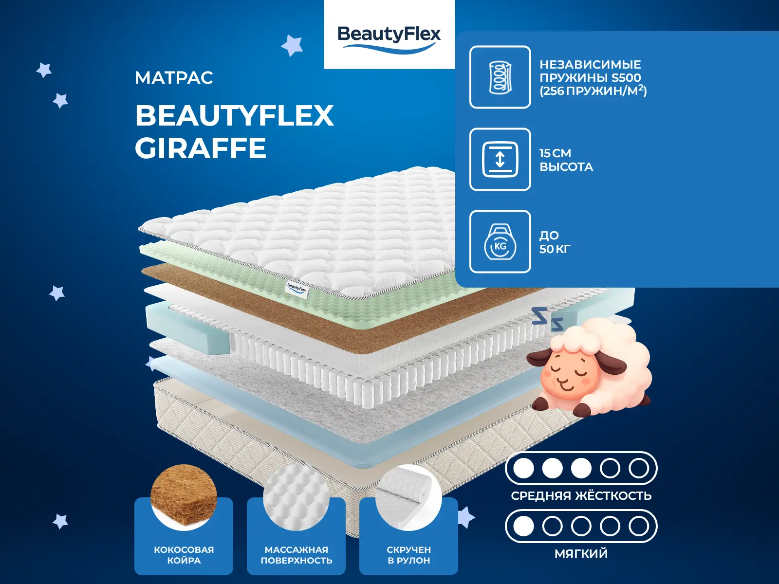 Детский матрас BeautyFlex с комбинированной жёсткостью (средняя и низкая). Модель Giraffe на основе блока независимых мини-пружин S500 (256 шт/м²) высотой 10 см, состоит из слоя ППУ с массажной поверхностью (1,5 см) и кокосовой койры (1 см) и изолирующим спанбондом с одной стороны, а также войлоком и слоем ППУ (2 см) с другой. Чехол из трикотажа со стёжкой синтепоном (100 гр) и бурлетом из рогожки. Максимальная нагрузка на одно спальное место матраса составляет 50 кг, а высота матраса — 15 см. Поставляется в скрученном виде. Жесткость: средняя / низкая. Состав матраса: