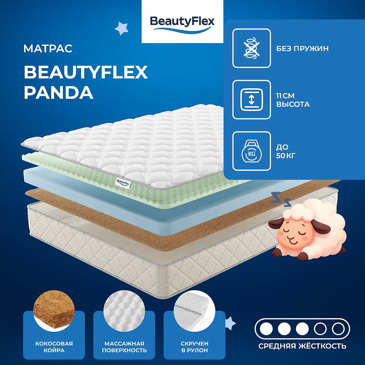 Беспружинный детский матрас BeautyFlex со средней жёсткостью. Модель Panda состоит из комфортного слоя ППУ с массажной поверхностью (1,5 см), блока ППУ толщиной 8 см в основе и кокосовой койры толщиной 1 см с другой стороны. Чехол выполнен из трикотажа со стёжкой синтепоном (100 гр) и бурлетом из рогожки. Максимальная нагрузка на одно спальное место составляет 50 кг, а высота матраса — 11 см. Матрас поставляется в компактном скрученном виде. Жесткость: средняя. Состав матраса: