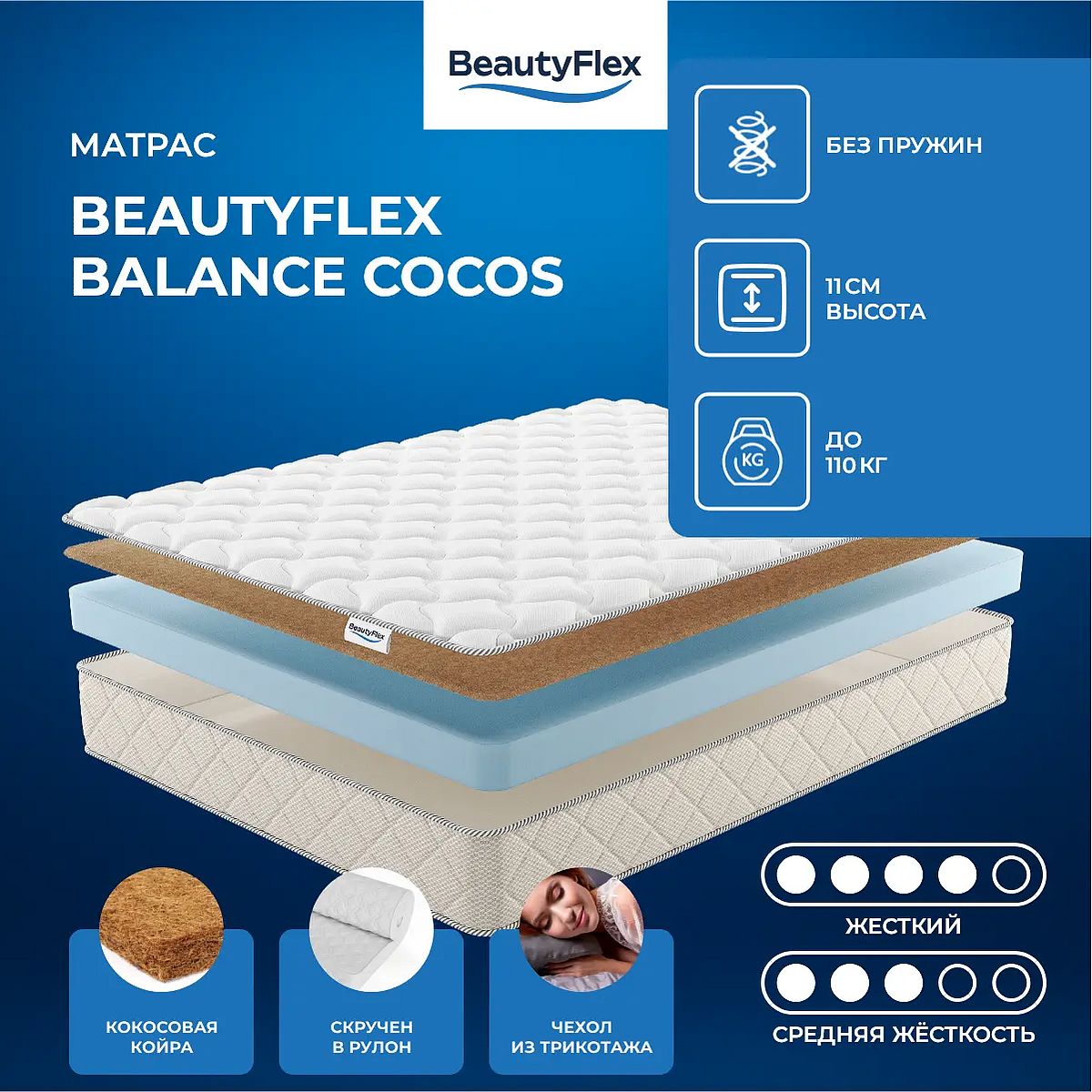 Беспружинный матрас BeautyFlex Balance Cocos имеет жёсткость выше средней и среднюю жёсткость с разных сторон. Он состоит из моноблока ППУ высотой 10 см и слоя кокосовой койры толщиной 1 см. Чехол матраса выполнен из трикотажа со стёжкой на синтепоне и рогожки по бурлету. Высота матраса — 11 см. Максимальная допустимая нагрузка для одного спального места — 110 кг. Матрас привезут в скрученном виде, удобном для транспортировки. Жесткость: выше средней / средняя. Состав матраса: