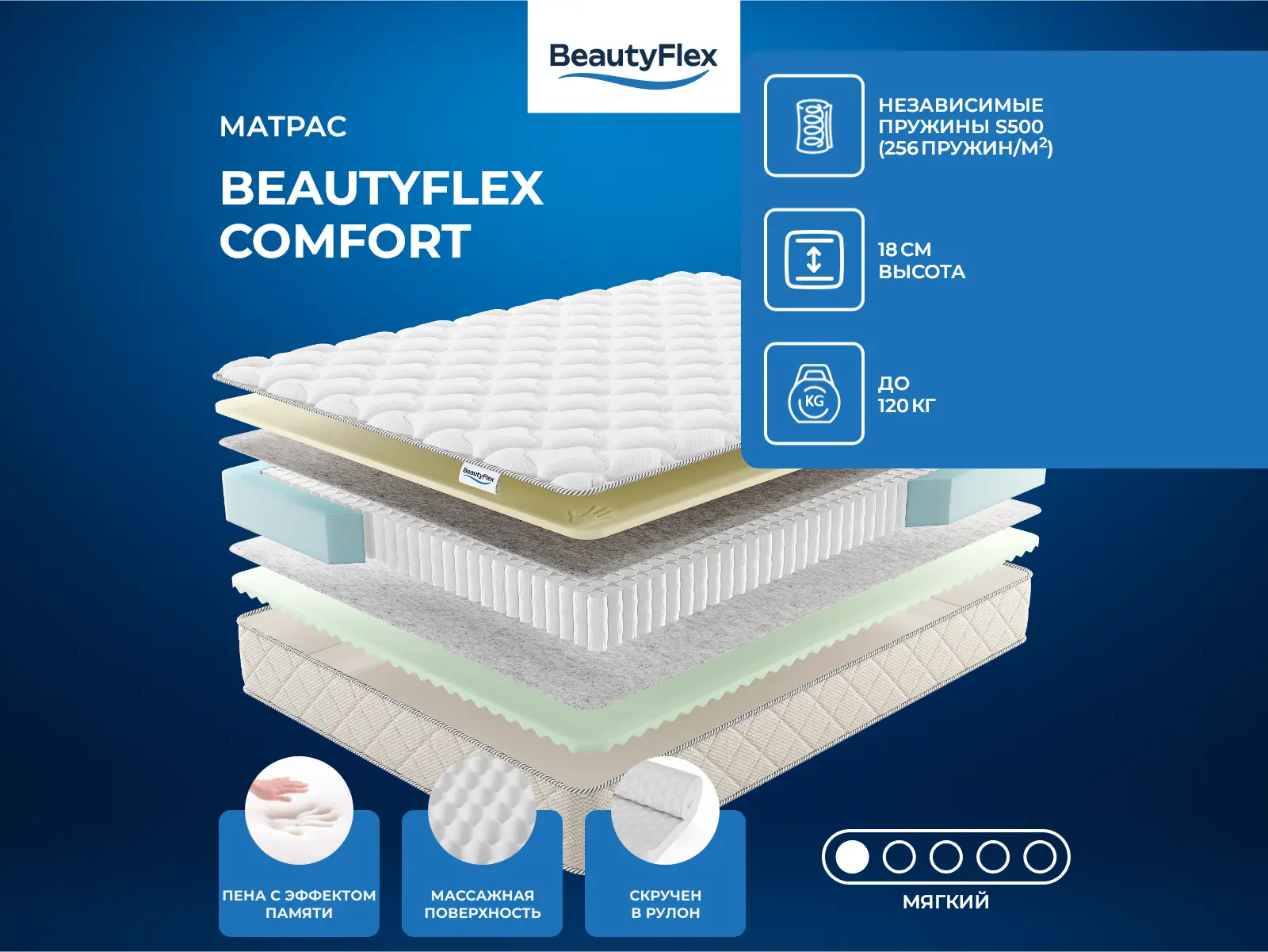 Пружинный матрас BeautyFlex Comfort имеет две стороны с разной жёсткостью: мягкую и среднежесткую. В основе модели — блок независимых пружин S500 (256 шт/м²) с войлоком с двух сторон. Комфортное наполнение сторон: пена с эффектом памяти (2 см) и ППУ с массажной поверхностью (1,5 см). Чехол выполнен из трикотажа, стёганным с синтепоном (100 г/м²), по боковинам с бурлетом из рогожки. Максимальный вес на одно спальное место составляет 120 кг, а высота матраса — 18 см. Матрас поставляется в скрученном виде, удобном для транспортировки. Жесткость: низкая. Состав матраса: