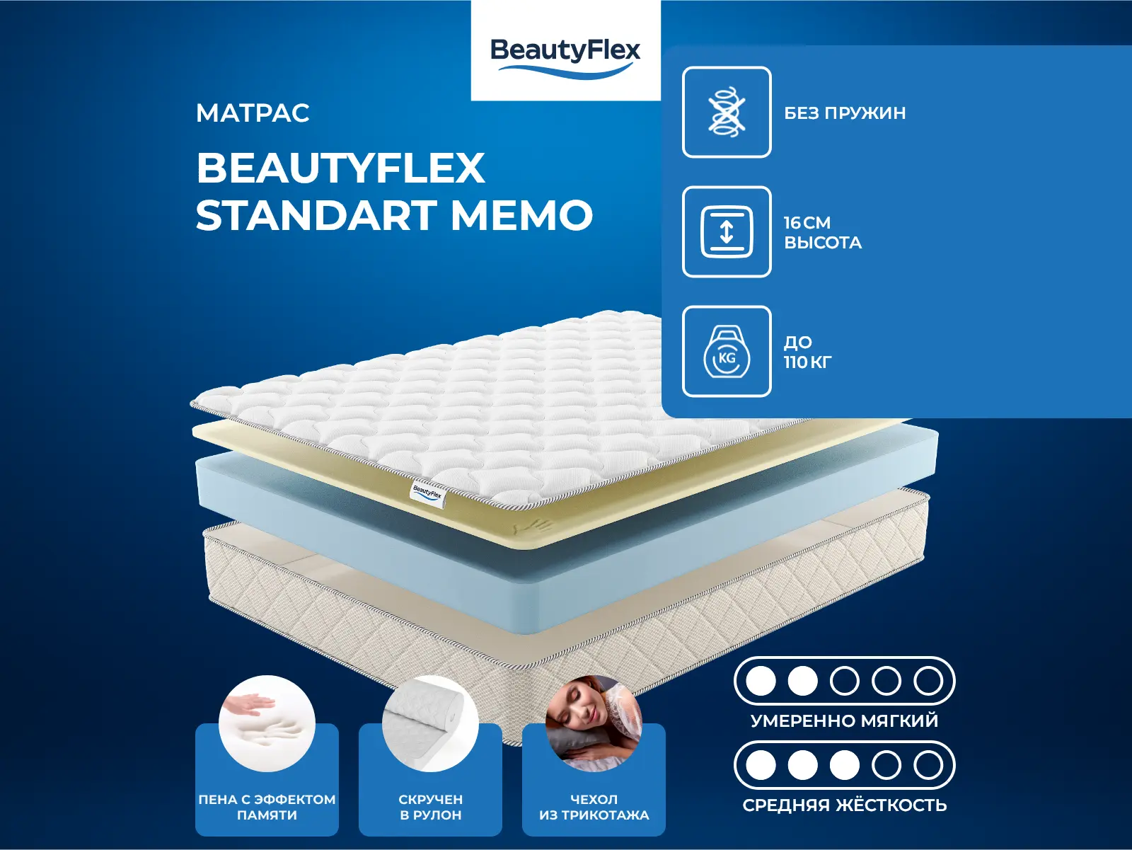 Комфортный беспружинный матрас BeautyFlex с разной жёсткостью сторон — ниже средней и средней. Модель Standart Memo состоит из моноблока пенополиуретана толщиной 14 см и пены с эффектом памяти толщиной 2 см с более мягкой стороны. Чехол выполнен из трикотажа со стёжкой синтепоном (100 г/м²) и рогожки по бурлету. Высота матраса — 16 см. Максимальный вес, на который рассчитана модель, составляет 110 кг на одно спальное место. Матрас поставляется в удобном для транспортировки скрученном виде. Жесткость: ниже средней / средняя. Состав матраса: