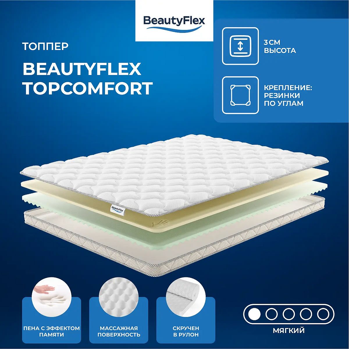 Топпер BeautyFlex TopComfort имеет две стороны с разной жёсткостью: низкую и среднюю.Сторона с низкой жёсткостью состоит из пены с эффектом памяти толщиной 2 см. Сторона со средней жёсткостью содержит ППУ с массажной поверхностью толщиной 1,5 см. Чехол топпера выполнен из трикотажа со стёжкой синтепоном плотностью 100 г/м² и бурлетом из рогожки. Крепление осуществляется с помощью резинок по углам. Высота топпера составляет 3 см. Поставляется в удобном для транспортировки скрученном виде. Жесткость: низкая. Состав матраса: