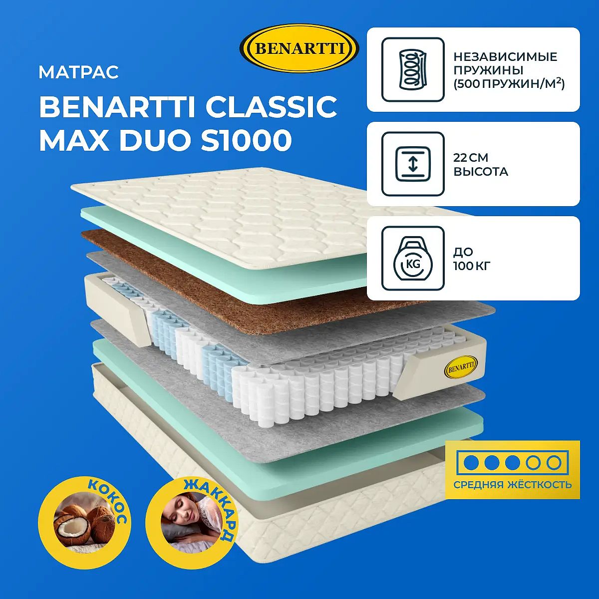Максимальная нагрузка на спальное место, кг: до 100. Высота, см: 22. Особенности работы пружин S1000Модель имеет в основе пружинную систему с надежной анатомической поддержкой. Это блок S1000. В такой системе на 1 кв. метр приходится по 500 пружин. Все они имеют одинаковый размер, очень маленькие и помещены в индивидуальные чехлы из прочного и износостойкого материала. Благодаря такому строению пружины оказывают точечное действие на тело спящего. Плавные переходы между пружинами способствуют равномерному распределению нагрузки и правильному положению тела на поверхности.Наполнение моделиС одной стороны модели проложены слои кокосовой койры и искусственного латекса. Кокос поддерживает тело в естественном положении, за счет постоянной циркуляции воздуха обеспечивает благоприятный микроклимат на поверхности. Это материал, который способен выдерживать большие нагрузки и не терять своей формы с течением времени. С другой стороны проложен слой искусственного латекса. Это мягкий и очень упругий материал, он обеспечивает упруго-эластичную поддержку для всего тела, способствует расслаблению и восстановлению тонуса мышц. Материал гигиеничный и абсолютно безопасный для здоровья.Чехол из хлопкового жаккардаВерхний слой модели – это чехол из хлопкового жаккарда с антибактериальной пропиткой. Чехол несъемный, простеган на гипоаллергенном холлконе.Защита матрасаДля защиты поверхности от загрязнений, попадания пыли и влаги на матрас рекомендуем купить защитный наматрасник-чехол или водонепроницаемый наматрасник.Другие моделиПосмотрите также другие модели с кокосом и ППУ: Benartti Classic Max Hard S1000, Benartti Classic Mega Hard S1000.