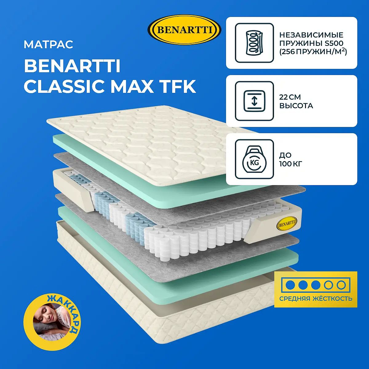 Матрас «Benartti Classic Max TFK» — средней жесткости, которая комфортна большинству людей среднего телосложения. Это — оптимальный вариант и детям, и взрослым, и пожилым людям.