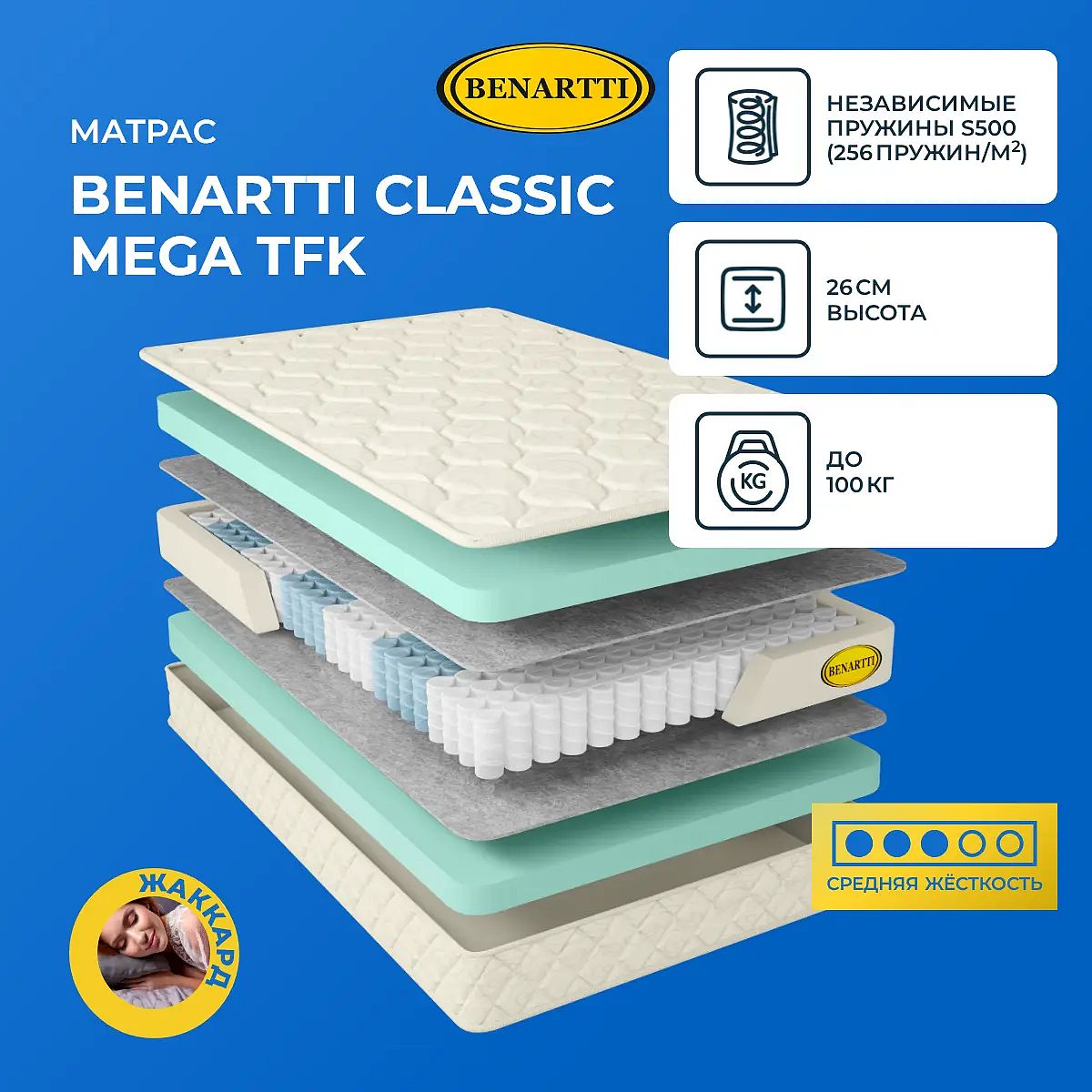 Максимальная нагрузка на спальное место, кг: до 100. Высота, см: 26. Особенности работы пружин TFKВ основе модели проложен блок TFK. Это 256 пружин на 1 кв. метр и каждая пружина упакована в отдельный чехол из прочной ткани. Благодаря этому пружины не выпадают и не деформируются. Они равномерно распределяют нагрузку по всей поверхности, и за счет этого обеспечивается анатомически правильное положение во время сна.Наполнение моделиВ качестве наполнителя используется искусственный латекс - материал синтетический, очень гигиеничный и прочный. Латекс обеспечивает упругую поддержку для всего тела, создает на спальной поверхности оптимальный микроклимат на счет постоянной подачи воздуха. Материал экологически чистый и абсолютно безопасный для здоровья.Чехол из хлопкового жаккардаВерхний слой модели – это чехол из хлопкового жаккарда с антибактериальной пропиткой. Чехол несъемный, простеган на гипоаллергенном холлконе.Защита матрасаДля защиты поверхности от загрязнений, попадания пыли и влаги на матрас рекомендуем купить защитный наматрасник-чехол или водонепроницаемый наматрасник.Другие моделиПосмотрите также другие модели с ППУ: Benartti Classic Max Hard TFK, Benartti Classic Mega Hard TFK.