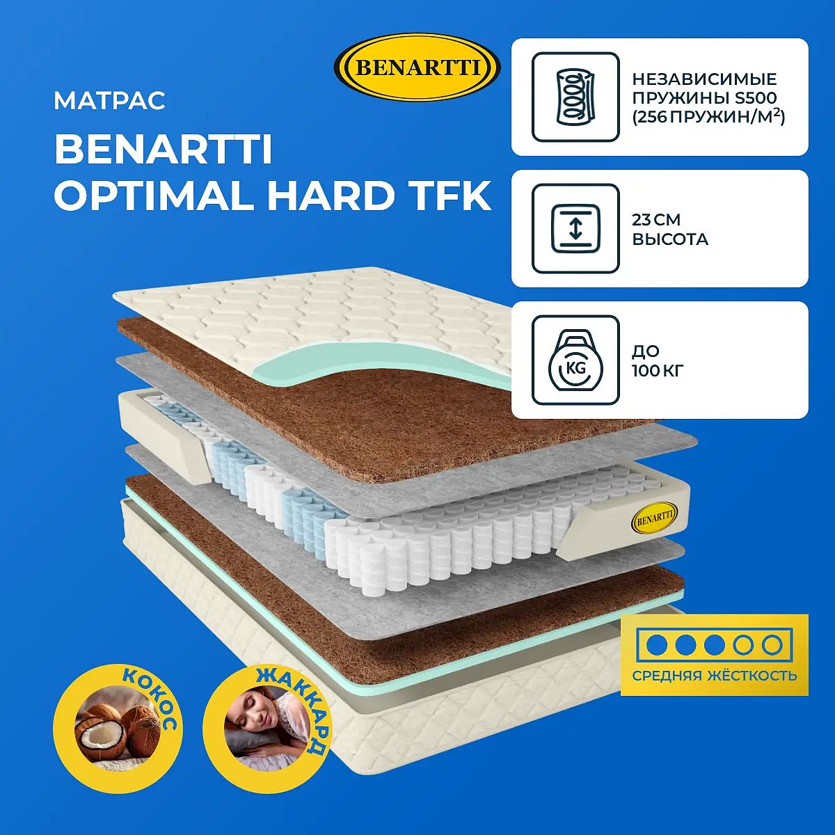 Максимальная нагрузка на спальное место, кг: до 100. Высота, см: 23. Наполнение моделиОсновным материалом модели служит натуральное кокосовое волокно. Это природный наполнитель, который характеризуется повышенной прочностью и износостойкостью. Кокос создает жесткую поверхность, способствует максимальному расслаблению и естественному положению тела во время сна, а также гарантирует надежную поддержку для позвоночника. Кокос хорошо вентилируется и не дает спящему перегреваться и чувствовать себя некомфортно во время сна.Действие пружин TFKМодель базируется на блоке независимых пружин TFK. Его плотность – 256 элементов на 1 кв. метр. Каждый элемент-пружина помещен в отдельный чехол и не связан с соседним. Это позволяет пружинам воздействовать на тело точечно и гарантирует надежную анатомическую поддержку. По обеим сторонам блок прикрыт слоем войлока. Материал защищает пружинный блок от деформаций, а также обеспечивает оптимальный микроклимат на поверхности.Чехол из жаккардаВерхний слой модели – это жаккардовая ткань, простеганная на гипоаллергенном холлконе и искусственном латексе. Чехол обработан антибактериальной пропиткой, он несъемный.Защита матрасаДля защиты поверхности от загрязнений, попадания пыли и влаги на матрас рекомендуем купить защитный наматрасник-чехол или водонепроницаемый наматрасник.Другие моделиПосмотрите также другие модели с похожим наполнением: Benartti Optimal Mini TFK, Benartti Optimal Duo TFK.