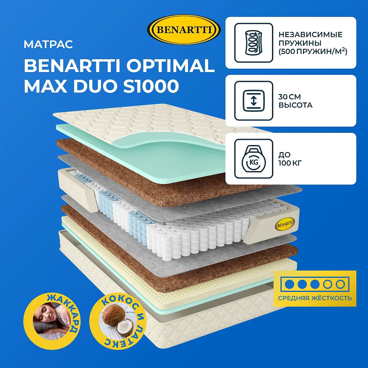 Максимальная нагрузка на спальное место, кг: до 100. Высота, см: 30. Сочетание кокоса и латексаМодель имеет различное наполнение. С обеих сторон проложена кокосовая койра. Это жесткий и максимально анатомичный материал, который не вызывает аллергических реакций. Кокос благодаря наличию в его составе сухих волокон отлично проводит воздух и устанавливает на поверхности постоянный воздухообмен. Кокос обеспечивает надежную поддержку для позвоночника, а также не исключает дискомфорт на спальной поверхности.Сочетание кокоса и ППУС одной стороны к кокосу приложен слой натурального латекса, а с другой – искусственного латекса. Оба вида латекса - мягкие, только натуральный более упругий и эластичный. Он имеет способность подстраиваться под все контуры тела и повторять их. Искусственный латекс обеспечивает надежную и упругую основу для тела, хорошо пропускает воздух и обеспечивает оптимальный микроклимат на поверхности.Действие пружин S1000В основе модели находится пружинный блок, отличающийся повышенным анатомическим эффектом. Блок имеет в составе 1000 пружин, по 500 на 1 кв. метр. Пружины запакованы в отдельные чехлы и распределяют нагрузку равномерно. Такое строение пружин позволяет создать комфортную спальную поверхность и обеспечивать надежную поддержку для всего тела.Чехол из жаккардаВерхний слой модели – это жаккардовая ткань, простеганная на гипоаллергенном холлконе и искусственном латексе. Чехол обработан антибактериальной пропиткой, он несъемный.Защита матрасаДля защиты поверхности от загрязнений, попадания пыли и влаги на матрас рекомендуем купить защитный наматрасник-чехол или водонепроницаемый наматрасник.Другие моделиПосмотрите также другие модели с похожим наполнением: Benartti Optimal Duo S1000, Benartti Optimal Hard S1000.