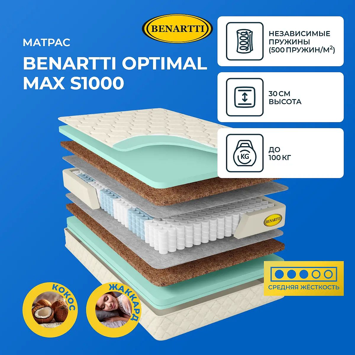 Максимальная нагрузка на спальное место, кг: до 100. Высота, см: 30. Действие пружин S1000Основу модели составляет пружинный блок S1000. Это конструкция состоит из 1000 элементов, по 500 на 1 кв. метр. Блок характеризуется повышенной анатомичностью, он позволяет позвоночнику правильно формироваться, а также дарит комфорт во время сна. Пружины в составе блока имеют одинаковую форму и длину проволоки. Они помещены в отдельные чехлы и действуют точечно.Наполнение моделиПоверхность модели средне-жесткая, она образована сочетанием кокосовой койры и искусственного латекса. Оба материала гипоаллергенные и экологически чистые. Оба характеризуются высокой степенью гигиеничности. Кокос способствует естественному положению тела на спальной поверхности, а также не позволяет телу перегреваться во время сна. Искусственный латекс смягчает кокос, формирует упруго-эластичную поддержку и создает оптимальный микроклимат на поверхности.Чехол из жаккардаВерхний слой модели – это жаккардовая ткань, простеганная на гипоаллергенном холлконе и искусственном латексе. Чехол обработан антибактериальной пропиткой, он несъемный.Защита матрасаДля защиты поверхности от загрязнений, попадания пыли и влаги на матрас рекомендуем купить защитный наматрасник-чехол или водонепроницаемый наматрасник.Другие моделиПосмотрите также другие модели с похожим наполнением: Benartti Optimal Duo S1000, Benartti Optimal Hard S1000.