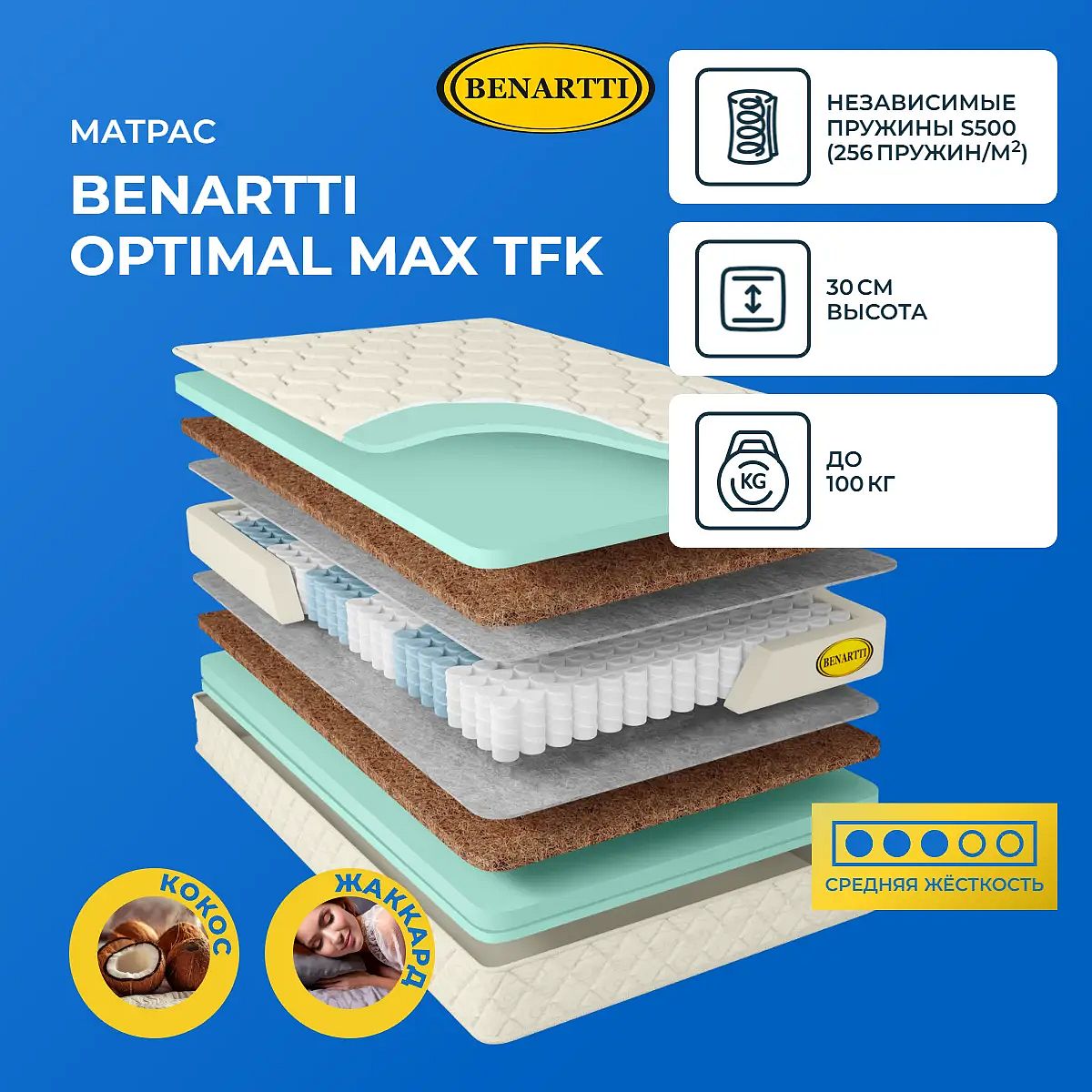 Максимальная нагрузка на спальное место, кг: до 100. Высота, см: 30. Наполнение моделиМодель имеет одинаковое наполнение с обеих сторон. Материалами служат: натуральное кокосовое волокно и искусственный латекс. Кокос обеспечивает максимальную поддержку всего тела, позволяет позвоночнику находиться в естественном положении во время сна и не дает телу перегреваться. Это гигиеничный материал без запаха. Искусственный латекс оказывает упругую поддержку для всего тела, он способствует его релаксации. На его поверхности поддерживается благоприятный микроклимат. Это также гигиеничный и гипоалергенный наполнитель, не имеющий запаха и не выделяющий токсины.Действие пружин TFKВ основе модели проложен блок пружин TFK. В такой конструкции все элементы распределяются равномерно, пружины находятся в индивидуальных чехлах и действуют только тогда, когда на них направлена нагрузка. Поэтому такой блок характеризуется высокой степенью поддержки. Общая плотность такой конструкции – 256 микропружин на 1 кв. метр.Чехол из жаккардаВерхний слой модели – это жаккардовая ткань, простеганная на гипоаллергенном холлконе и искусственном латексе. Чехол обработан антибактериальной пропиткой, он несъемный.Защита матрасаДля защиты поверхности от загрязнений, попадания пыли и влаги на матрас рекомендуем купить защитный наматрасник-чехол или водонепроницаемый наматрасник.Другие моделиПосмотрите также другие модели с похожим наполнением: Benartti Optimal Duo TFK, Benartti Optimal Hard TFK.