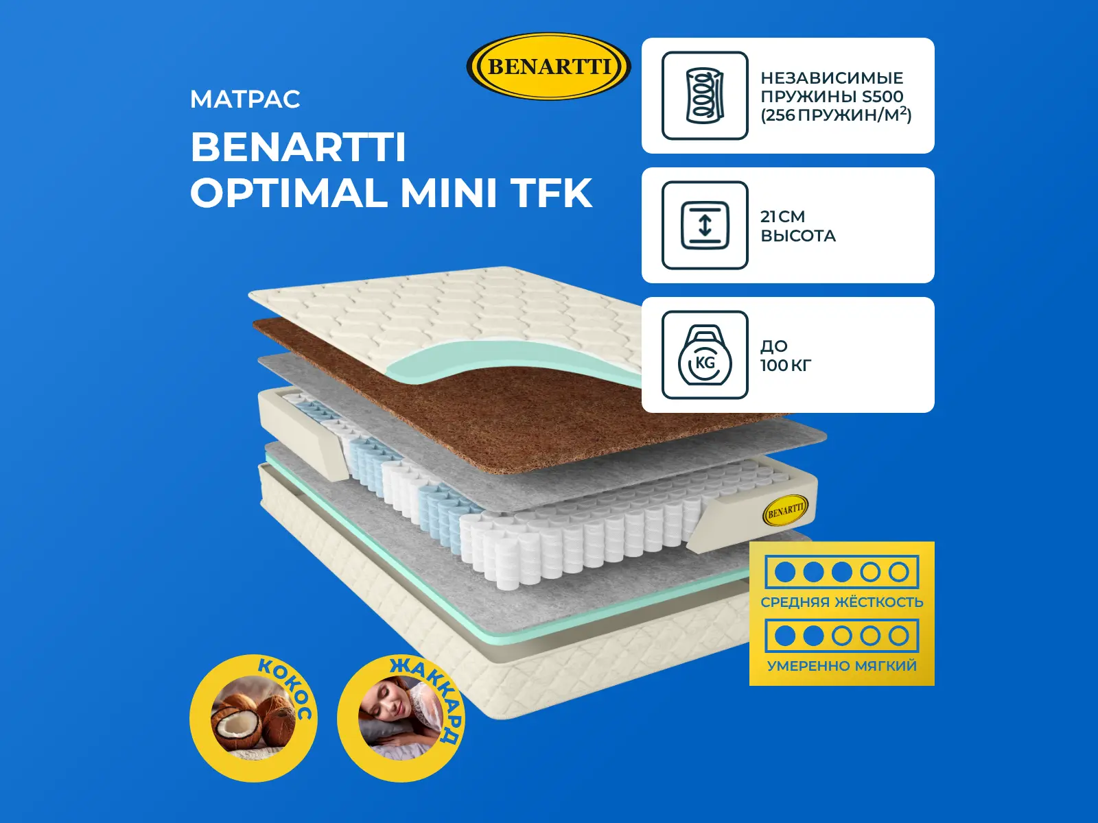 Максимальная нагрузка на спальное место, кг: до 100. Высота, см: 21. Наполнение моделиДвустороннее наполнение определяет наличие двух материалов в модели – это кокосовая койра и натуральный войлок. Кокос располагается с одной стороны и делает ее жесткой, а войлок – с другой, это более мягкая сторона.Сочетание кокоса и войлокаКокосовая поверхность способствует комфортному сну, правильному распределению нагрузки по поверхности, а также естественному положению тела во время сна. Кокос за счет входящих в него сухих волокон хорошо проводит воздух, а также быстро исправляет влагу с поверхности. Это гипоаллергенный и безопасный к использованию материал без запаха. Поверхность из войлока более мягкая, войлок хорошо проводит воздух, а также создает необходимый для здорового и спокойного сна теплообмен. Войлок - экологически чистый материал без запаха.Действие пружин TFKМодель базируется на блоке независимых пружин TFK. Его плотность – 256 элементов на 1 кв. метр. Каждый элемент-пружина помещен в отдельный чехол и не связан с соседним. Это позволяет пружинам воздействовать на тело точечно и гарантирует надежную анатомическую поддержку. По обеим сторонам блок прикрыт слоем войлока.Чехол из жаккардаВерхний слой модели – это жаккардовая ткань, простеганная на гипоаллергенном холлконе и искусственном латексе. Чехол обработан антибактериальной пропиткой, он несъемный.Защита матрасаДля защиты поверхности от загрязнений, попадания пыли и влаги на матрас рекомендуем купить защитный наматрасник-чехол или водонепроницаемый наматрасник.Другие моделиПосмотрите также другие модели с похожим наполнением: Benartti Optimal Hard TFK, Benartti Optimal Soft TFK.