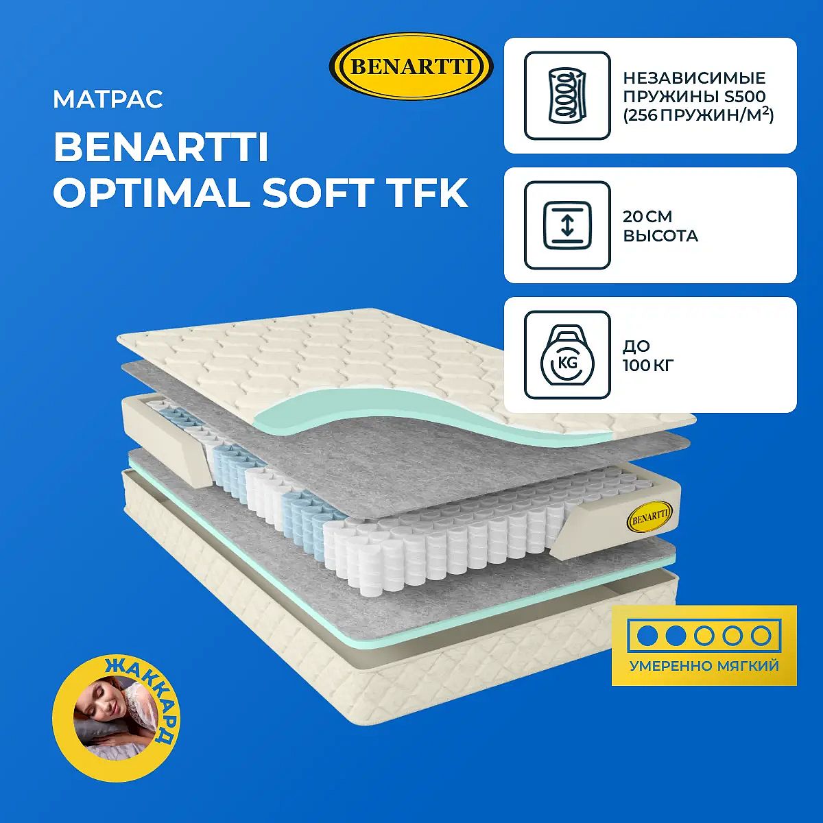 Максимальная нагрузка на спальное место, кг: до 100. Высота, см: 20. Наполнение моделиМодель имеет мягкую поверхность и изготавливается на основе натурального войлока. Войлок очень прочный и термостойкий. Он обеспечивает благоприятный микроклимат на поверхности, создает постоянный теплообмен и комфортную поверхность для сна. Термовойлок абсолютно безопасен для здоровья, в том числе и для аллергиков.Действие пружин TFKМодель изготавливается на пружинном блоке TFK, в котором более 500 пружин, по 256 на 1 кв. метр. Пружины плотно приставлены к друг к другу, но при этом не соприкасаются, так как помещены в индивидуальные чехлы из прочной и износостойкой ткани. Они оказывают точечное воздействие на тело спящего, позволяя ему ощущать комфорт и принимать естественное положение во время сна.Чехол из жаккардаВерхний слой модели – это жаккардовая ткань, простеганная на гипоаллергенном холлконе и искусственном латексе. Чехол обработан антибактериальной пропиткой, он несъемный.Защита матрасаДля защиты поверхности от загрязнений, попадания пыли и влаги на матрас рекомендуем купить защитный наматрасник-чехол или водонепроницаемый наматрасник.Другие моделиПосмотрите также другие модели с похожим наполнением: Benartti Optimal Soft S1000, Benartti Optimal Mini TFK.