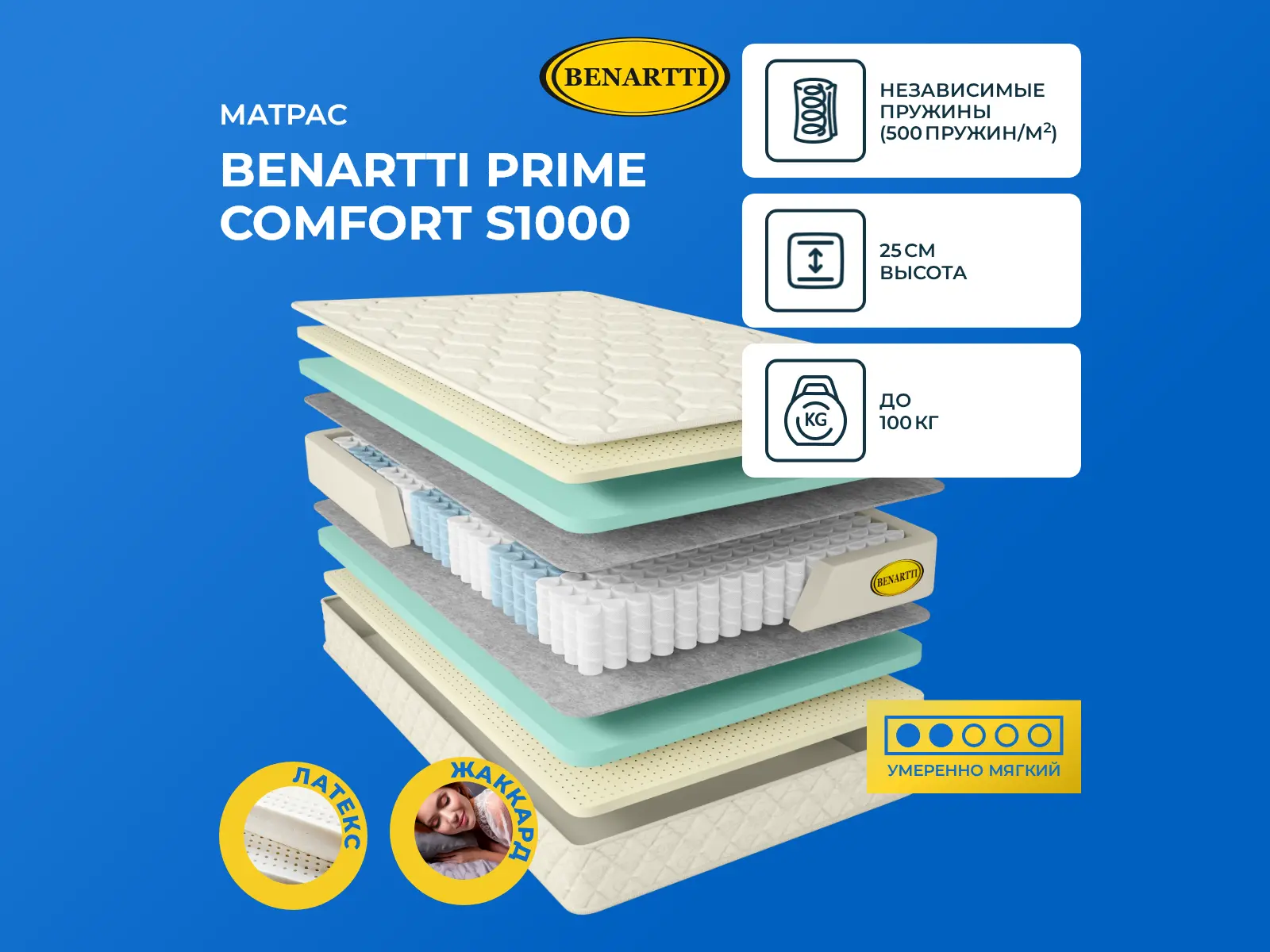 Максимальная нагрузка на спальное место, кг: до 100. Высота, см: 25. Действие пружин S1000Модель базируется на основе блока независимых пружин S1000. В такой конструкции по 500 микропружин расположены на 1 кв. метре. Пружины имеют одинаковую форму и размер и помещены в отдельные чехлы. Поэтому нагрузка в таком блоке распределяется равномерно по всей поверхности. Такой блок гарантирует высокий анатомический эффект и мягкий и комфортный сон.Наполнение моделиВ качестве наполнителей используются мягкие материалы, такие, как натуральный и искусственный латекс, или ППУ. ППУ менее эластичный и упругий, но более плотный. Он способен выдерживать большие нагрузки. Материал отлично вентилируется и создает на поверхности оптимальный микроклимат. Натуральный латекс максимально эластичен, он способствует расслаблению тела, снятию мышечного напряжения и восстановлению тонуса мышц. Оба материала не способны вызывать аллергические реакции.Чехол из хлопкового жаккардаВерхний слой модели – это чехол из хлопкового жаккарда с антибактериальной пропиткой. Чехол несъемный, простеган на гипоаллергенном холлконе.Защита матрасаДля защиты поверхности от загрязнений, попадания пыли и влаги на матрас рекомендуем купить защитный наматрасник-чехол или водонепроницаемый наматрасник.Другие моделиПосмотрите также другие модели на блоке S1000: Benartti Prime Comfort Max S1000, Benartti Prime Hard S1000.
