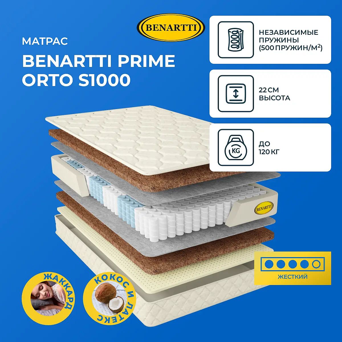 Максимальная нагрузка на спальное место, кг: до 120. Высота, см: 22. Действие пружин S1000В качестве пружинной основы используется независимый пружинный блок S1000. В нем по 500 микропружин находятся на 1 кв. метре. Такое большое количество позволяет достигнуть еще большего анатомического эффекта. Каждая пружина помещена в отдельный чехол и действует лишь тогда, когда на нее непосредственно направлена нагрузка.Наполнение моделиС одной стороны модели проложен слой кокосовой койры. Это природный жесткий наполнитель, который обеспечивает надежную анатомическую поддержку для позвоночника и всего тела в целом. Материал очень прочный и износостойкий, способен выдерживать большие нагрузки. С другой стороны проложен слой натурального латекса и кокоса. Латекс немного смягчает кокос, делает его более упругим. Латекс способствует снятию мышечного напряжения и восстановлению кровообращения.Чехол из хлопкового жаккардаВерхний слой модели – это чехол из хлопкового жаккарда с антибактериальной пропиткой. Чехол несъемный, простеган на гипоаллергенном холлконе.Защита матрасаДля защиты поверхности от загрязнений, попадания пыли и влаги на матрас рекомендуем купить защитный наматрасник-чехол или водонепроницаемый наматрасник.Другие моделиПосмотрите также другие модели с кокосом и латексом: Benartti Prime Middle S1000, Benartti Prime Mini S1000.