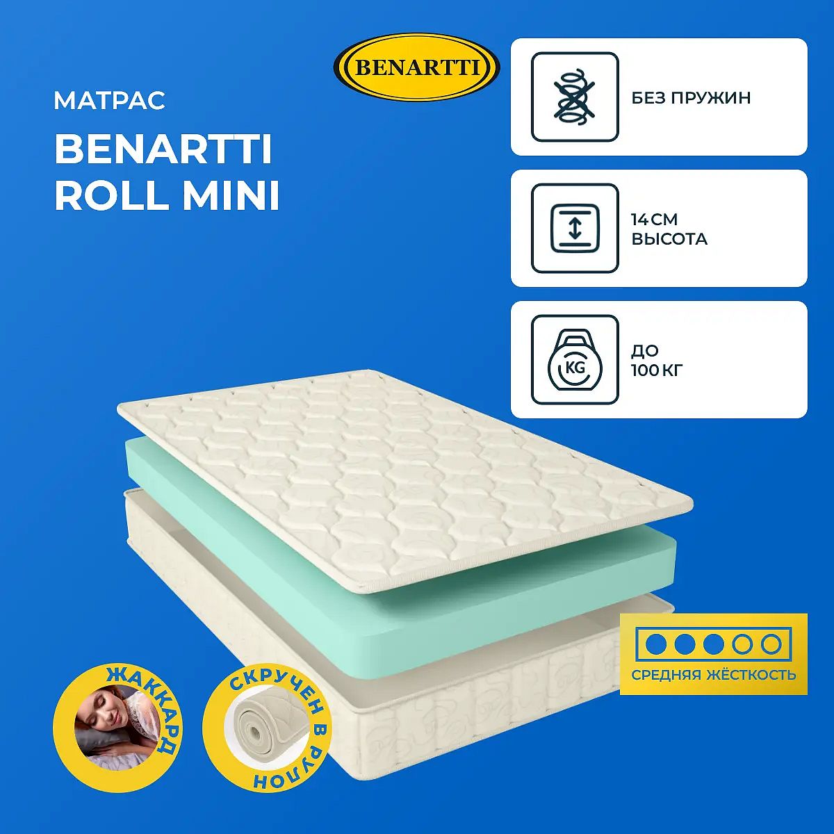 Максимальная нагрузка на спальное место, кг: до 100. Высота, см: 14. *Поставляется в скрученном виде. Стёжка и цвет чехла матраса может отличаться от представленного на фото. Транспортировка матрасаМодель доставляется скрученной по короткой стороне и в вакуумной упаковке, что заметно облегчает процесс транспортировки. Ее удобно использовать как дома, так и на даче или в качестве дополнительного спального места.Наполнение матрасаМатериалом модели служит искусственный латекс. Это современный гибкий и упругий материал, который отлично справляется с большими нагрузками и не теряет своей формы со временем. Латекс способствует снятию напряжения и релаксации всего тела. Это гипоаллергенный материала без запаха, он не содержит вредных примесей и не вызывает аллергических реакций.Чехол из жаккардаЧехол модели – это жаккардовая ткань, простеганная на гипоаллергенном холлконе. Чехол обработан антибактериальной пропиткой, он несъемный.Защита матрасаДля защиты поверхности от загрязнений, попадания пыли и влаги на матрас рекомендуем купить защитный наматрасник-чехол или водонепроницаемый наматрасник.Другие моделиПосмотрите также другие модели с похожим наполнением: Benartti Roll Standart, Benartti Roll Mega.