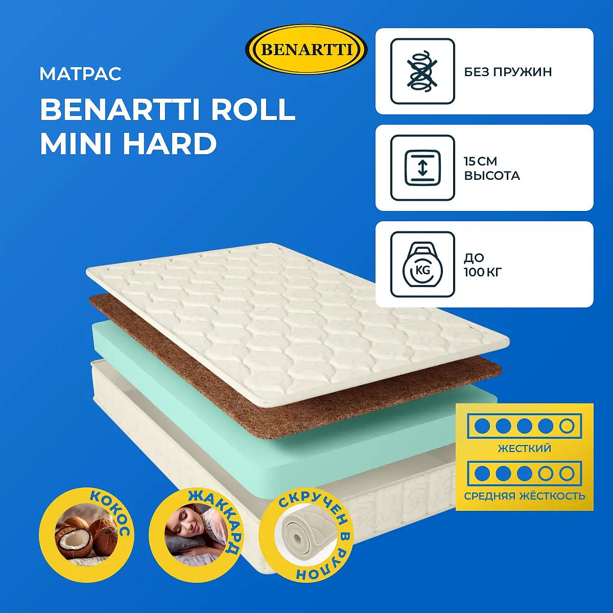 Максимальная нагрузка на спальное место, кг: до 100. Высота, см: 15. *Поставляется в скрученном виде. Стёжка и цвет чехла матраса может отличаться от представленного на фото. Транспортировка матрасаМодель собирается и скручивается на производстве, после разворачивания принимает форму в течение 3-х часов. Такой матрас удобно перевозить с места на место, его можно использовать как дома, так и на даче. Благодаря компактной упаковке матрас можно перевозить даже в салоне автомобиля.Наполнение матрасаВ качестве наполнителей с одной стороны используется кокосовая койра, а с другой стороны искусственный латекс. Так как модель двусторонняя, ее можно периодически переворачивать и, таким образом, менять жесткость спального места. Кокосовая сторона жесткая и максимально анатомичная. Кокос способствует расслаблению тела и позволяет формировать правильные позы во время сна. Кокос хорошо пропускает воздух и создает оптимальный микроклимат на поверхности. Искусственный латекс с одной стороны создает средне-жесткую поверхность, на которой тело может расслабиться и отдохнуть. Материал также хорошо вентилируется и не позволяет спящему перегреваться во время сна. Оба материала являются гипоаллергенными и не имеют запаха.Чехол из жаккардаЧехол модели – это жаккардовая ткань, простеганная на гипоаллергенном холлконе. Чехол обработан антибактериальной пропиткой, он несъемный.Защита матрасаДля защиты поверхности от загрязнений, попадания пыли и влаги на матрас рекомендуем купить защитный наматрасник-чехол или водонепроницаемый наматрасник.Другие моделиПосмотрите также другие модели с похожим наполнением: Benartti Roll Standart Hard, Benartti Roll Mega Hard.