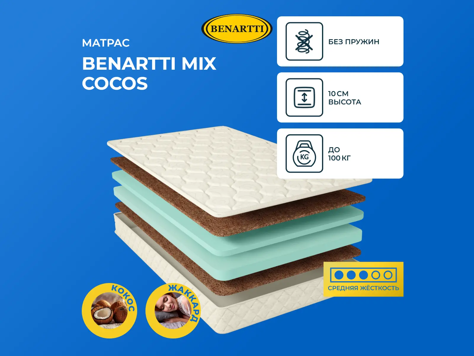 Максимальная нагрузка на спальное место, кг: до 100. Высота, см: 10. Наполнение моделиМодель имеет универсальную средне-жесткую поверхность, то есть подойдет для тех, кто не выбирает слишком жесткие или слишком мягкие поверхности. По обеим сторонам матраса располагаются слои кокосовой койры. Это природный материал, обладающий повышенной прочностью и износостойкостью. Кокос выдерживает множество нагрузок и не рассыхается со временем. Это материал с повышенными бактерицидными свойствами. На его поверхности исключается появление вредных микроорганизмов и пыли. В центре располагается блок искусственного латекса. Это тоже прочный материал, но более упругий. Он способствует расслаблению, снимает усталость. Искусственный латекс имеет пористое строение, благодаря которому хорошо пропускает воздух, таким образом, материал дышит. Оба наполнителя гипоаллергенные и не имеют запаха.Чехол из жаккардаВерхний слой модели – это жаккардовая ткань, простеганная на гипоаллергенном холлконе и искусственном латексе. Чехол обработан антибактериальной пропиткой, он несъемный.Защита матрасаДля защиты поверхности от загрязнений, попадания пыли и влаги на матрас рекомендуем купить защитный наматрасник-чехол или водонепроницаемый наматрасник.Другие моделиПосмотрите также другие модели с похожим наполнением: Benartti Mix Hard, Benartti Mix Natural.