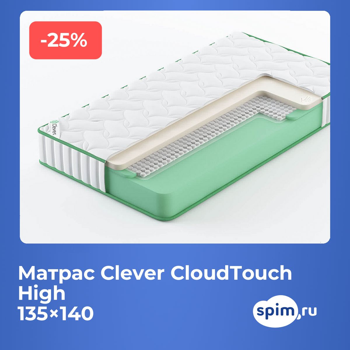 Советы по уходуДля продления срока службы рекомендуется использовать защитный наматрасник (не входит в комплект). Чехол не снимается, поэтому регулярная сухая чистка и проветривание помогут сохранить свежесть ткани. О производителеClever Mattress — российский бренд, производящий матрасы в подмосковном Щелково с 2014 года. В коллекции Clever сочетаются современные наполнители, надежные пружины и прочные ткани для сбалансированного комфорта и выверенного баланса цены и качества. Clever CloudTouch High — это мягкий матрас для ежедневного отдыха.