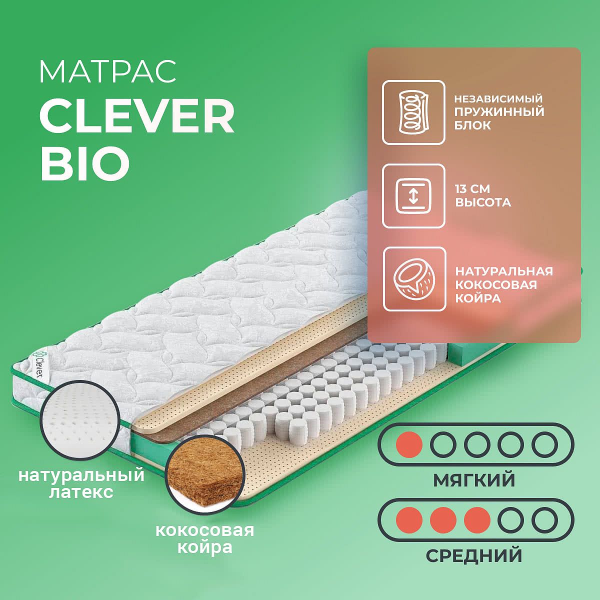 Максимальная нагрузка, кг: 80. Высота, см: 13. Матрас скручен в рулон. Матрас Clever Bio можно назвать классическим — в нем используется блок независимых пружин, натуральный латекс и кокосовые волокна. В этой модели использованы уменьшенные по высоте независимые пружины TFK Slim (8 см). Ход каждой пружины не зависит от соседней, это позволяет матрасу точечно воспринимать нагрузку и избежать “проваливания” тела в матрас. У матраса две разные жесткости, достаточно просто перевернуть изделие на нужную сторону. Сторона средней жесткости выполнена сочетанием кокосовой койры (1 см) и натурального латекса (2 см). Кокос обеспечивает жесткость и равномерное распределение нагрузки, а латекс упруг, но в то же время эластичен, он растягивается, подстраиваясь под каждую часть тела. Другая сторона — мягкая имеет только слой натурального латекса. Что кокос, что латекс хорошо пропускаю воздух и не впитывают влагу.