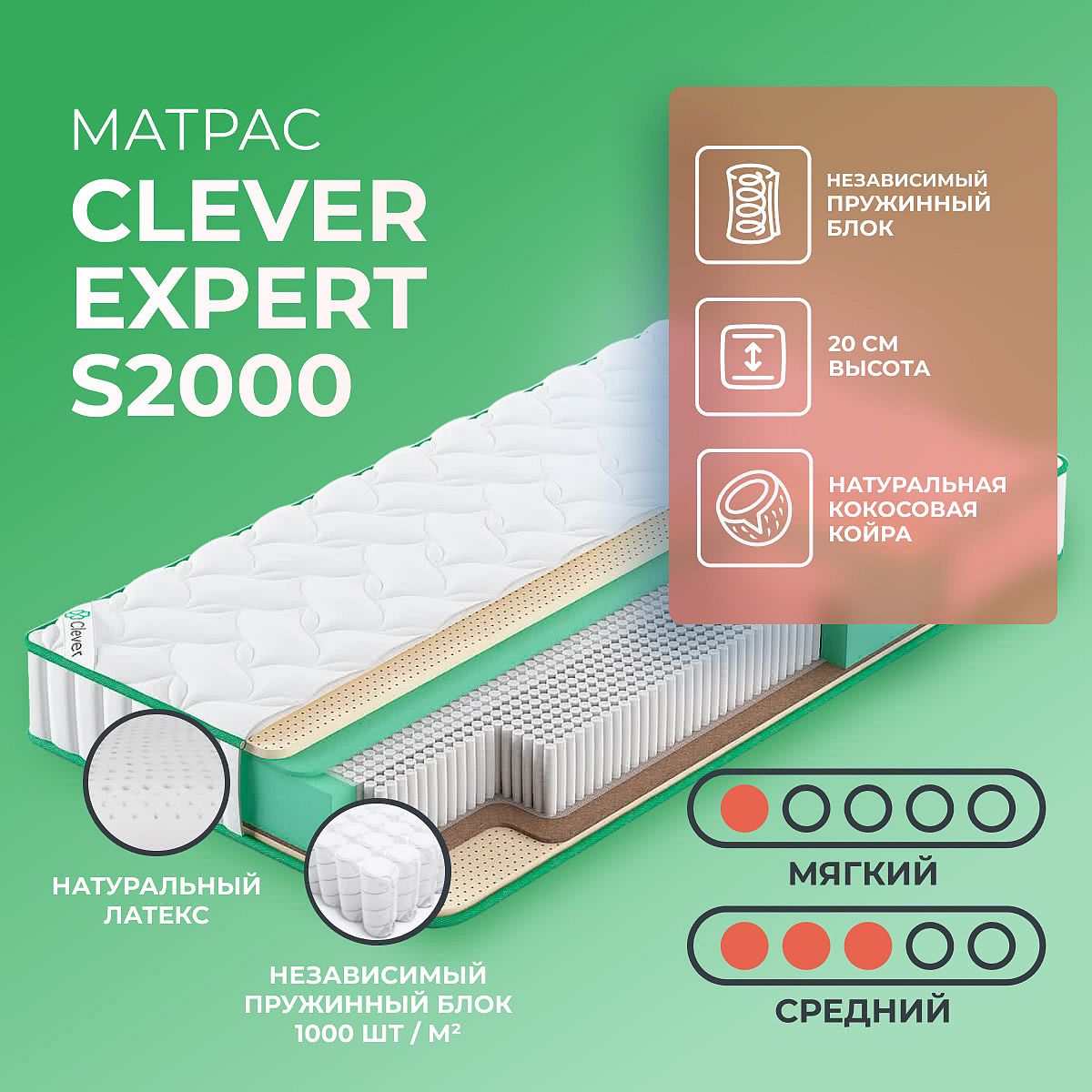 Матрас Clever Expert S2000 из коллекции Soul — это продуманное сочетание комфорта и поддержки для полноценного отдыха. Благодаря разным сторонам с мягкой и средней жёсткостью, матрас легко адаптируется к индивидуальным предпочтениям. Высота 20 см и современный состав слоёв обеспечивают приятные ощущения при каждом прикосновении, а независимый пружинный блок S2000 (1000 пружин на м2) равномерно распределяет нагрузку, снижая давление на тело. Пружинный матрас Clever Expert S2000 подходит для ежедневного сна и рассчитан на максимальный вес до 130 кг на спальное место. Латекс и кокосовая койра в составе слоёв придают упругость и долговечность, а жаккардовый чехол с аккуратной простёжкой сохраняет свежесть и форму изделия. Такой матрас поможет расслабиться после насыщенного дня и заботится о вашем комфорте каждую ночь. Ключевые особенности