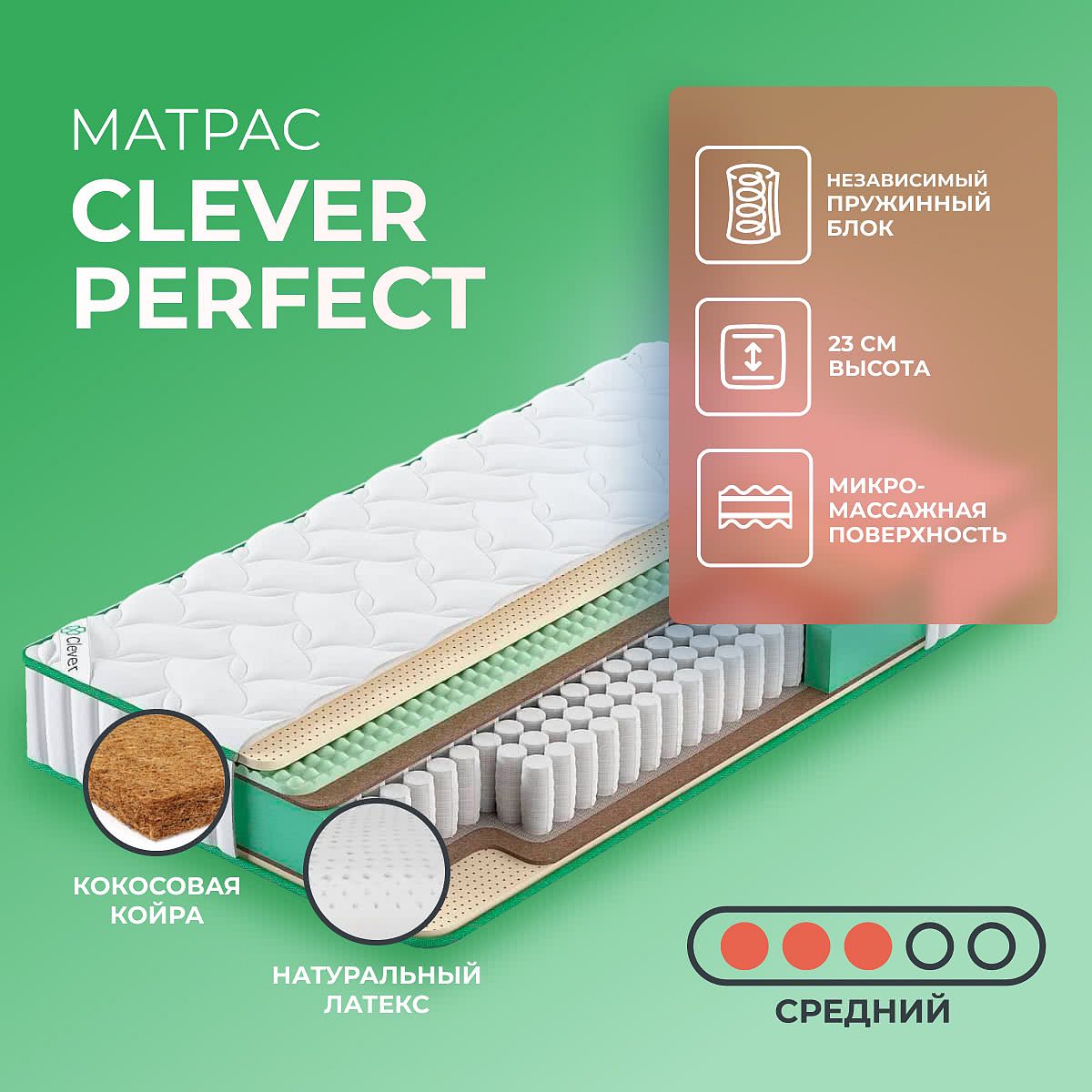 Нагрузка на спальное место, кг: 110. Высота, см: 23. В основе модели Clever Perfect — независимые пружины TFK. Блок пружин содержит 500 пружин на каждое спальное место. Ход каждой пружины не зависит от соседей — каждая пружина вставлена в специальный прочный чехол. Матрас с таким блоком способен равномерно и точечно воспринимать нагрузку. Матрас двусторонний, но жесткости сторон одинаковые. Главное отличие в эффекте — с одной стороны матрас имеет микромассажное действие, которое делает отдых на такой поверхности более комфортным и расслабляющим. С обеих сторон присутствует кокосовая койра и натуральный латекс. Койра дает жесткость и правильную поддержку позвоночника, а натуральный латекс, за счет эластичности и упругость повторяет контуры спящего. В роли микромассажного слоя с одной стороны выступает конволюторный пенополиуретан с рельефной нарезкой. Все материалы давно зарекомендовали с хорошей стороны в сфере производства матрасов, отлично пропускают воздух и не задерживает влагу.